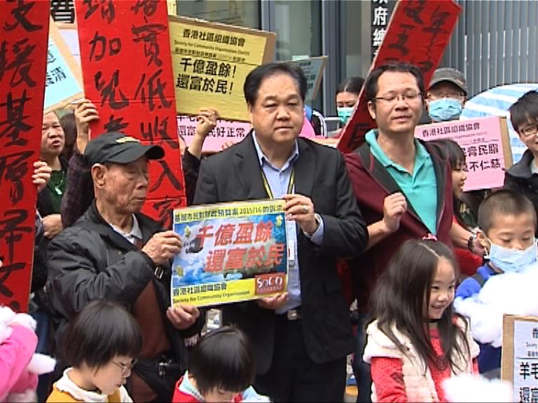 多個團體亦趁預算案發表前最後一個周末向財爺表達意見,今個財政年度又有超出預算的盈餘,社區組織協會期望預算案有措施對症下藥,協助基層,包括盡快設立低收入在職家庭津貼、加強託兒服務等。