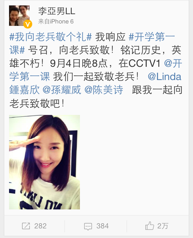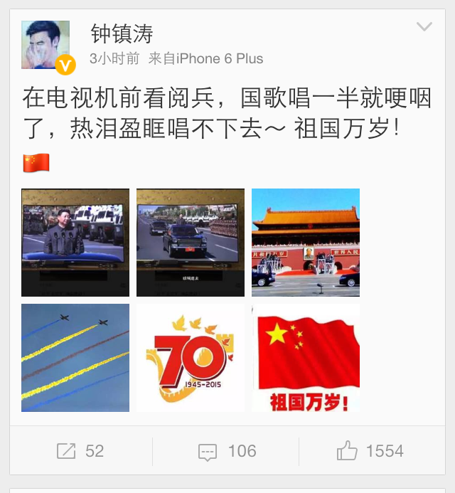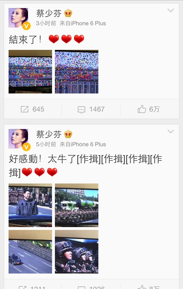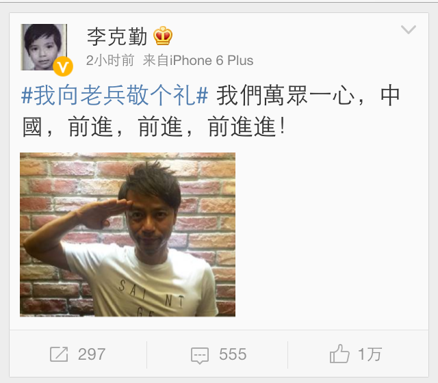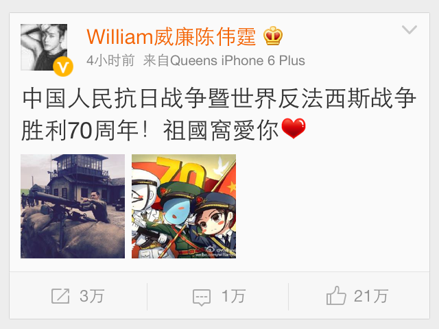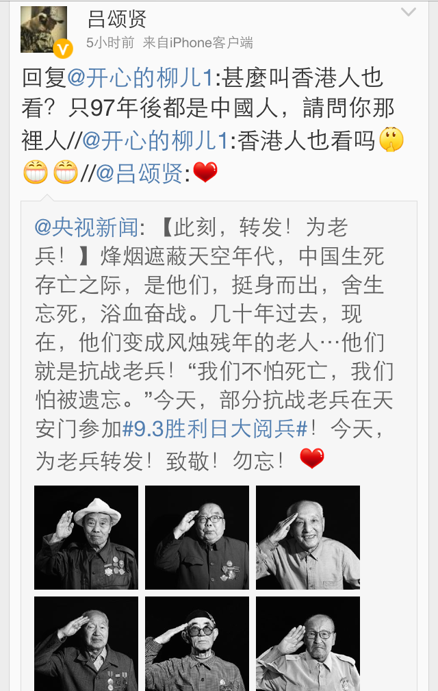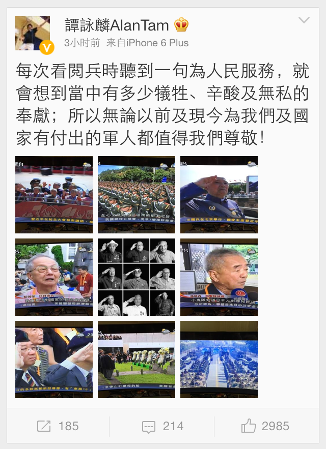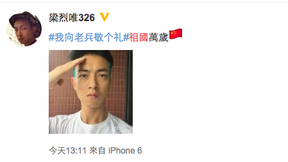 【now.com】為配合內地紀念抗日戰爭勝利70周年,香港人今日忽然多了一天公眾假期。而今早十時,中共在北京天安門廣場舉行中國抗戰勝利70周年閱兵式,想不到一眾香港藝人原來如此關心國家大事,紛紛在微博響應「#我向老兵敬個禮」活動,又晨早起床欣賞閱兵儀式,不少藝員都被祖國的強大感動到,在微博打下一篇篇感人之言。