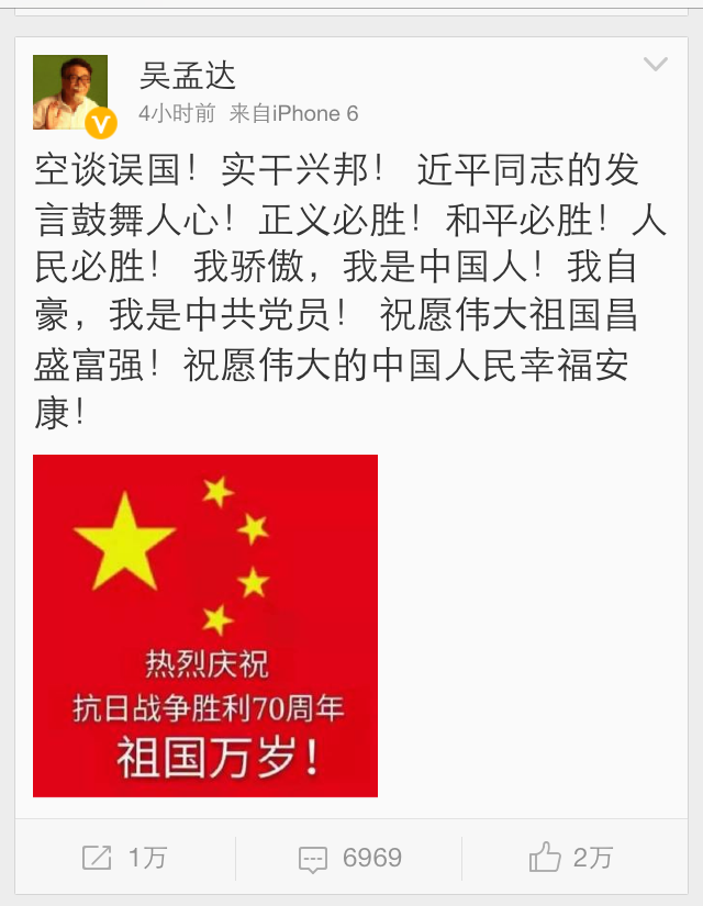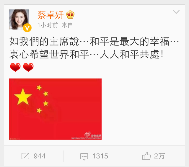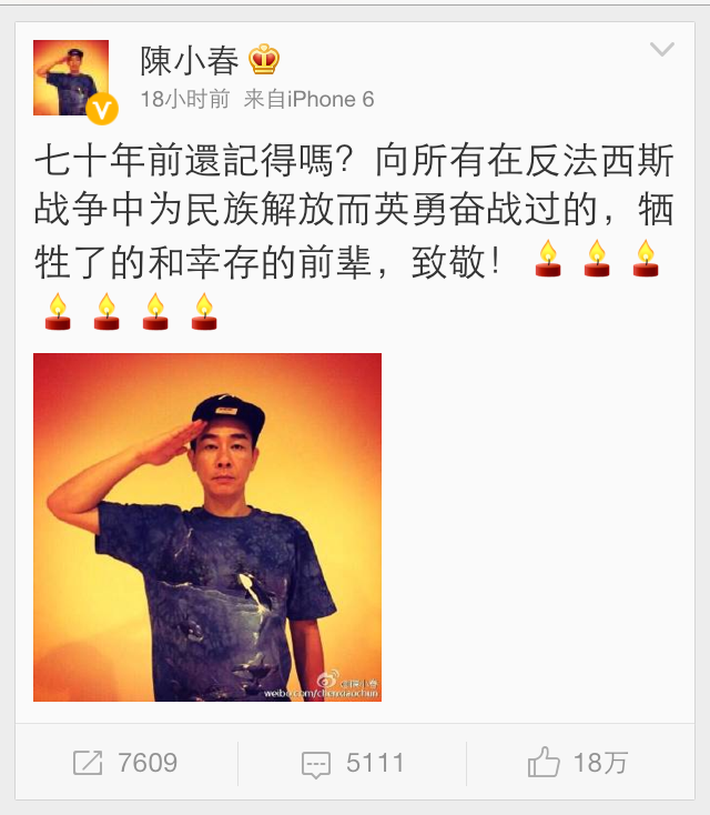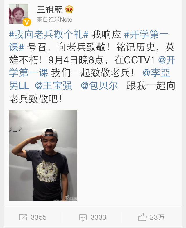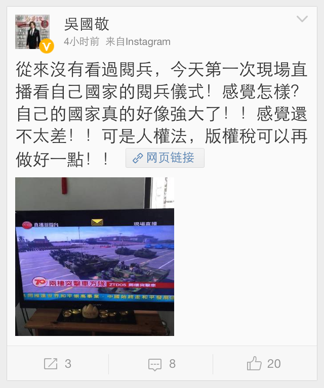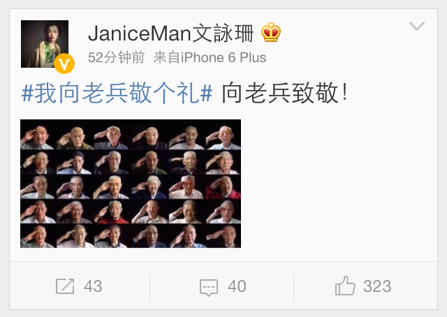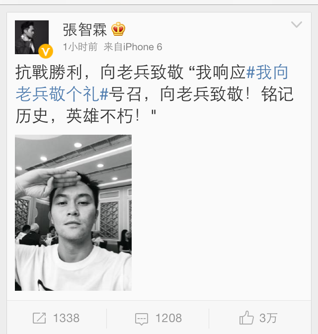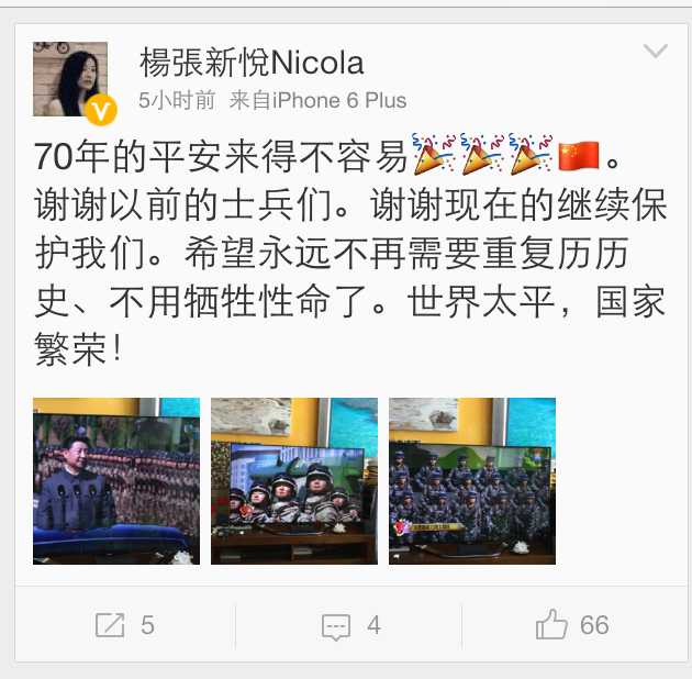 【now.com】為配合內地紀念抗日戰爭勝利70周年,香港人今日忽然多了一天公眾假期。而今早十時,中共在北京天安門廣場舉行中國抗戰勝利70周年閱兵式,想不到一眾香港藝人原來如此關心國家大事,紛紛在微博響應「#我向老兵敬個禮」活動,又晨早起床欣賞閱兵儀式,不少藝員都被祖國的強大感動到,在微博打下一篇篇感人之言。