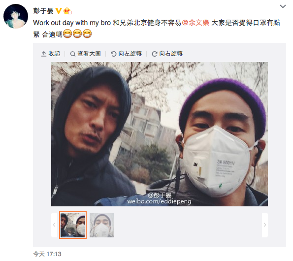 【now.com】北京近日再受到霧霾天氣影響,又發出空氣重污染預警。空氣質素變差,大家的日常生活都受到影響。台灣男星彭于晏到北京工作,遇上天氣欠佳,都一於少理,戴上口罩照樣外出。彭于晏更大膽到冒住霧霾天氣,與好兄弟余文樂出外做運動,他在微博留言說:「Work out day with my bro 和兄弟北京健身不容易,大家是否覺得口罩有點緊?合適嗎?」又晒出兩人在北京街頭的相片,網友都勸說天氣差要小心身體,不要健身。