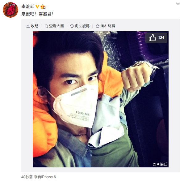 就連李治廷都受到霧霾天氣影響,身在北京的他都希望霧霾天氣離開。(微博截圖)