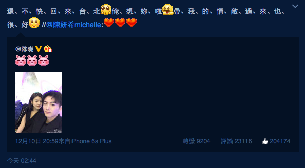 【now.com】陳妍希和陳曉自公開拍拖和宣傳結婚後,不時在網上大曬恩愛,日前兩人被影到一同回男方家鄉合肥,一舉一動都羨煞旁人。陳曉昨日又在微博上載和陳妍希的合照,身為陳妍希的好姊妹楊丞琳都看不過眼,轉發該微博,並留言「警告」二人不要重色輕友:「還、不、快、回、來、台、北,俺、想、妳、啦,帶、我、的、情、敵、過、來、也、很、好」