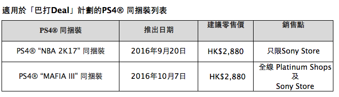 為宣傳新型PS4,SIEH推出「巴打Deal」計劃,明日起於全線PS Platinum Shops或Sony Store每買兩部全新型號PS4(1TB或500GB)或指定同捆裝,即可獲得4張$50現金券。另外,購買兩隻價值$350或以上的PS4同款遊戲軟件,即可獲得兩張$20現金券。留意,此計劃不適用於預訂訂單。