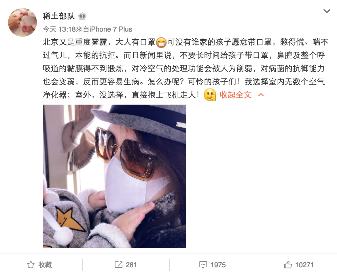今日下午章子怡的「稀土部隊」微博,上載一張她戴著黑超及口罩,及抱著小孩的相片,相信是細囡「醒醒」。章子怡留言指最近北京霧霾問題嚴重,而且又深怕長時間為小朋友戴口罩,會令到身體對冷空氣的處理功能被削弱,更說自己選擇過無數個室內空氣淨化器,但室外就沒有選擇,要一走了之:「北京又是重度霧霾,大人有口罩可沒有誰家的孩子願意帶口罩,憋得慌、喘不過氣兒,本能的抗拒。而且新聞裡說,不要長時間給孩子帶口罩,鼻腔及整個呼吸道的黏膜得不到鍛煉,對冷空氣的處理功能會被人為削弱,對病菌的抗禦能力也會變弱,反而更容易生病。怎麼辦呢?可憐的孩子們!我選擇室內無數個空氣淨化器;室外,沒選擇,直接抱上飛機走人!」不過子怡的留言一出,就有不少Fans都紛紛慨嘆「有錢人就有得選擇,但普通老百姓就只有接受」引起討論。