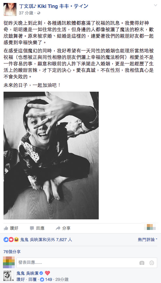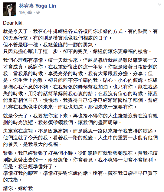 【now.com】近日娛圈喜事重重,昨晚台灣歌手林宥嘉(Yoga)透過社交網站宣布同女友丁文琪(KiKi)求婚,而女方大方回應接受,冧暈不少網友。事隔一晚Kiki仍然興奮,今日她透過Facebook分享感受。Kiki話她由昨晚開始收到不少祝福訊息,大呼感覺神奇:「從昨天晚上到此刻,各種通訊軟體都塞滿了祝福的訊息。我覺得好神奇,明明還是一如往常的生活,但身邊的人都像被灑了魔法的粉末,歡欣鼓舞著。原來被求婚、結婚是這樣的,連愛著我們的親朋好友都一起感覺到幸福快樂了。」帖文中Kiki更附上一張坐在地上興奮晒左手婚戒的黑白相片,帖文發出短短半小時就吸引過千Like,羨慕不少網友。