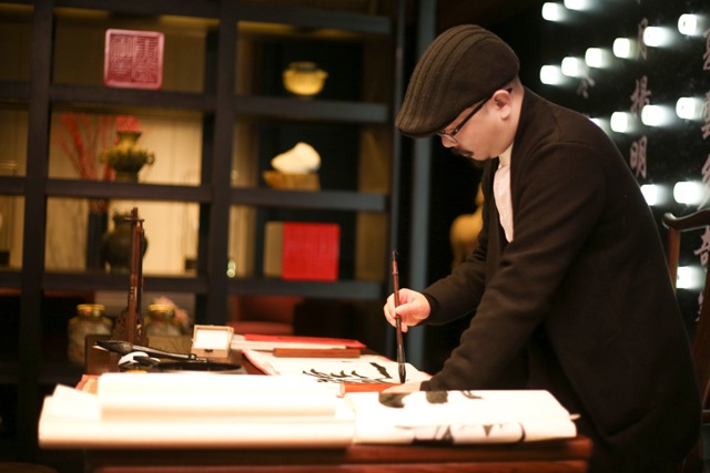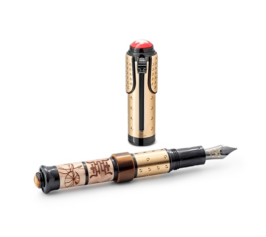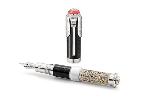 Montblanc High Artistry系列向康熙皇帝致敬限量版10,書法家的靈感源於康熙皇帝對於文學與書寫的熱情,因此墨玉材質之鋼筆筆蓋與筆身鐫刻了一首詩。為了表現康熙皇帝對於獵虎的喜愛,書寫工具的筆身飾以黃色藍寶石搭配黑色鍍銠金質虎首。筆蓋鐫刻之文字為康熙皇帝之書法,內容為陶淵明詩作,這些文字隱藏於一個可開啟式白金材質盾牌(shield)之下。筆尾底部鑲嵌一顆黃色藍寶石,如意造型的筆夾鑲嵌兩顆黃色藍寶石,象徵康熙皇帝穩固的君權。