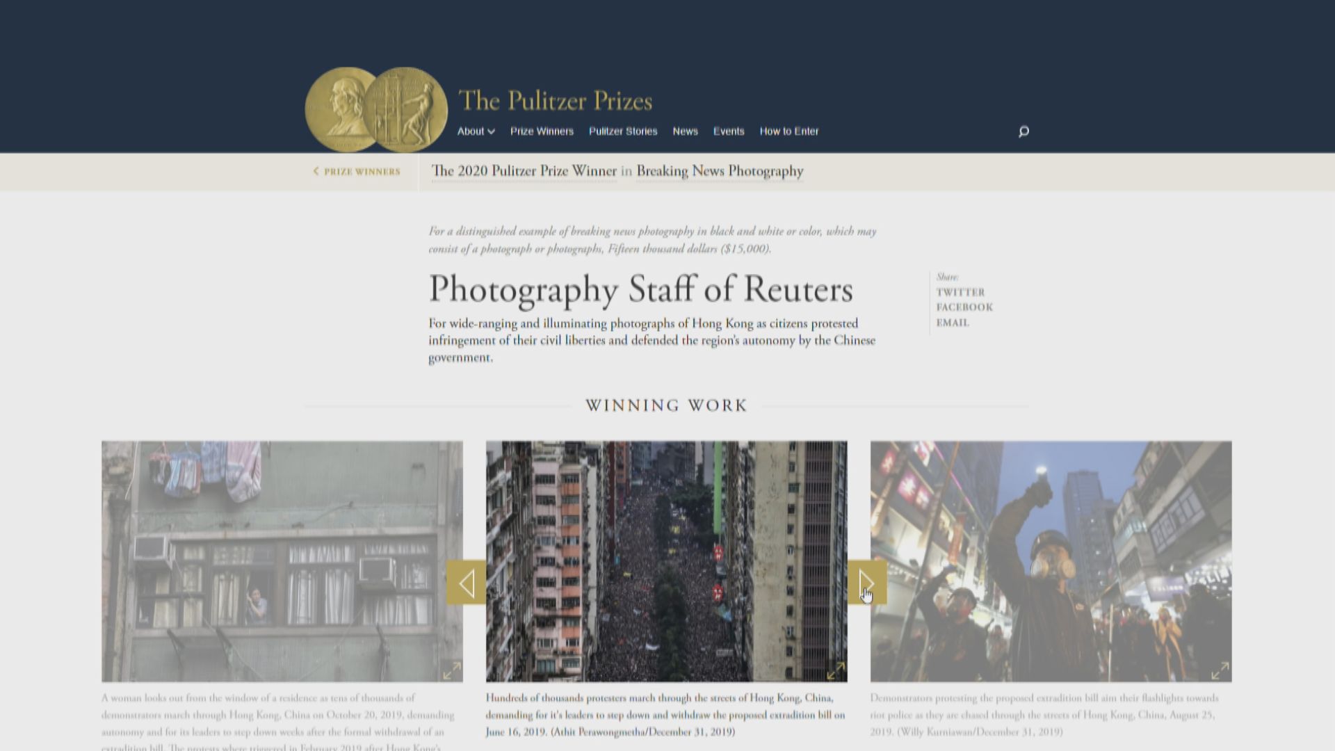 美國新聞界最高榮譽普立茲獎受新型冠狀病毒疫情影響,延後了兩周才公布。路透社憑報道香港反修例風波,榮獲突發新聞圖片獎,總編輯讚揚圖片深具啟發性,令人無法忘懷......