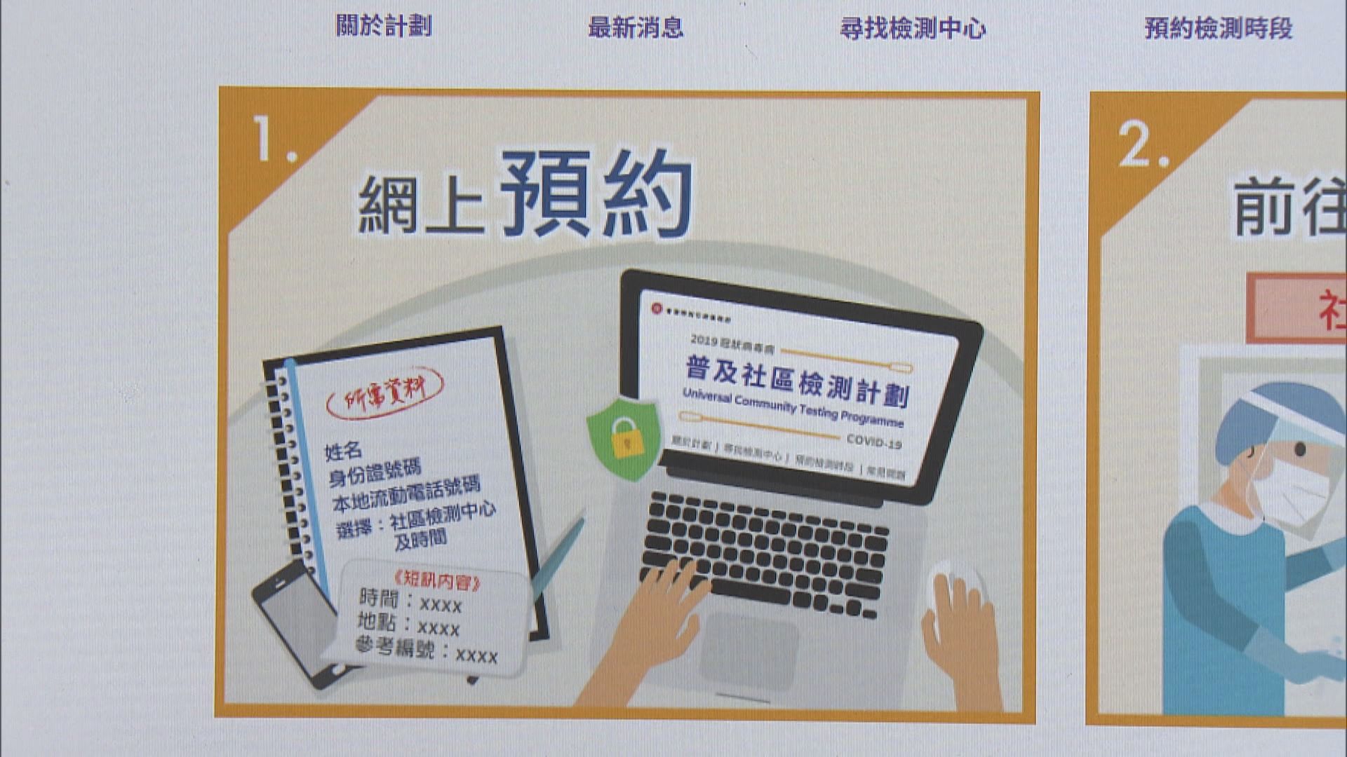 市民即日起可網上預約普及社區檢測計劃 市民即日起可網上預約普及社區檢測計劃 2020年8月29日 09:03 【Now新聞台】普及社區檢測計劃今日開始接受網上預約。 全民自願參與的普及社區檢測計劃,早上七時起可經網頁預約,市民預約時要提供姓名、身份證號碼。 進入預約系統後,網頁會顯示相關條款,包括所收集的資料不會作其他用途等,申請人確認後,需要輸入手機電話號碼,選取社區檢測中心地點及採樣時段。 完成預約後,系統畫面會顯示確認預約,約一分鐘後,收到電話短訊確認。
