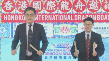 旅發局總幹事程鼎一及中國香港龍舟總會會長勞鑑,為他們合辦的國際龍舟邀請賽揭開序幕。邀請賽下月15及16日於尖東海濱舉辦,有逾四千名選手,來自12個國家或地區,包括香港、內地、泰國及阿聯酋等。他們組成超過170支隊伍,參與17項賽事,包括今年增設的國慶75周年盃,及之前舉辦過的18區盃賽及「扮嘢大賽」等。