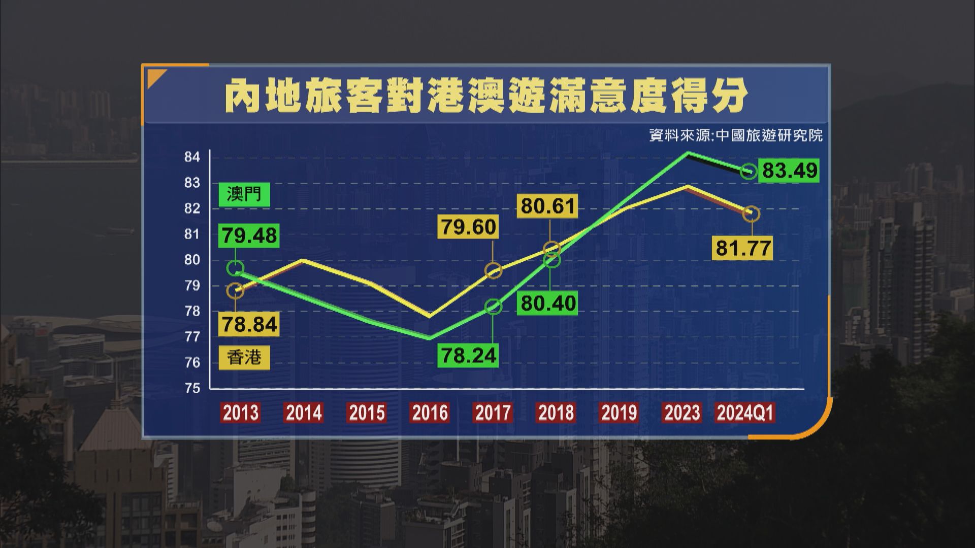 今年首季內地旅客對港澳遊滿意度,香港和澳門分別有81.77和83.49分,不過在排名方面,2017年曾經排名榜首的香港就跌至第七位,澳門就首次排名第一。