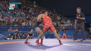戰神廣場競技場,黑衫、25歲的曹利國要向個人運動員生涯最重要的冠軍挑戰——男子古典式60公斤級決賽,對手是比他大3歲、日本的文田健一郎,亦是三年前東京奧運銀牌得主。