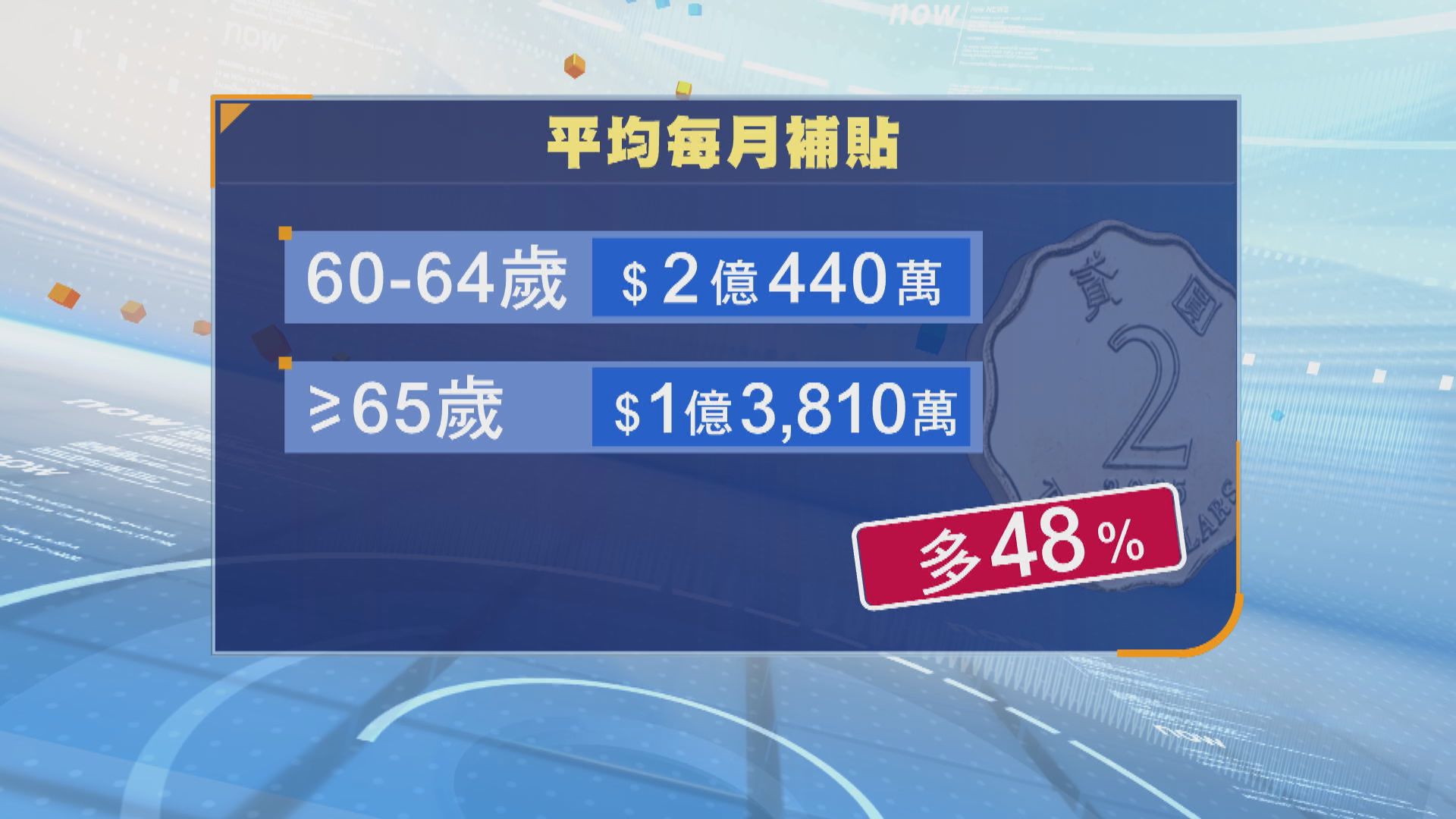 政府平均每個月補貼60至64歲人士2億440萬元,雖然他們的受惠人數較少,但65歲或以上人士本身乘巴士及地鐵等有半價優惠,他們比65歲或以上的補貼多近半。