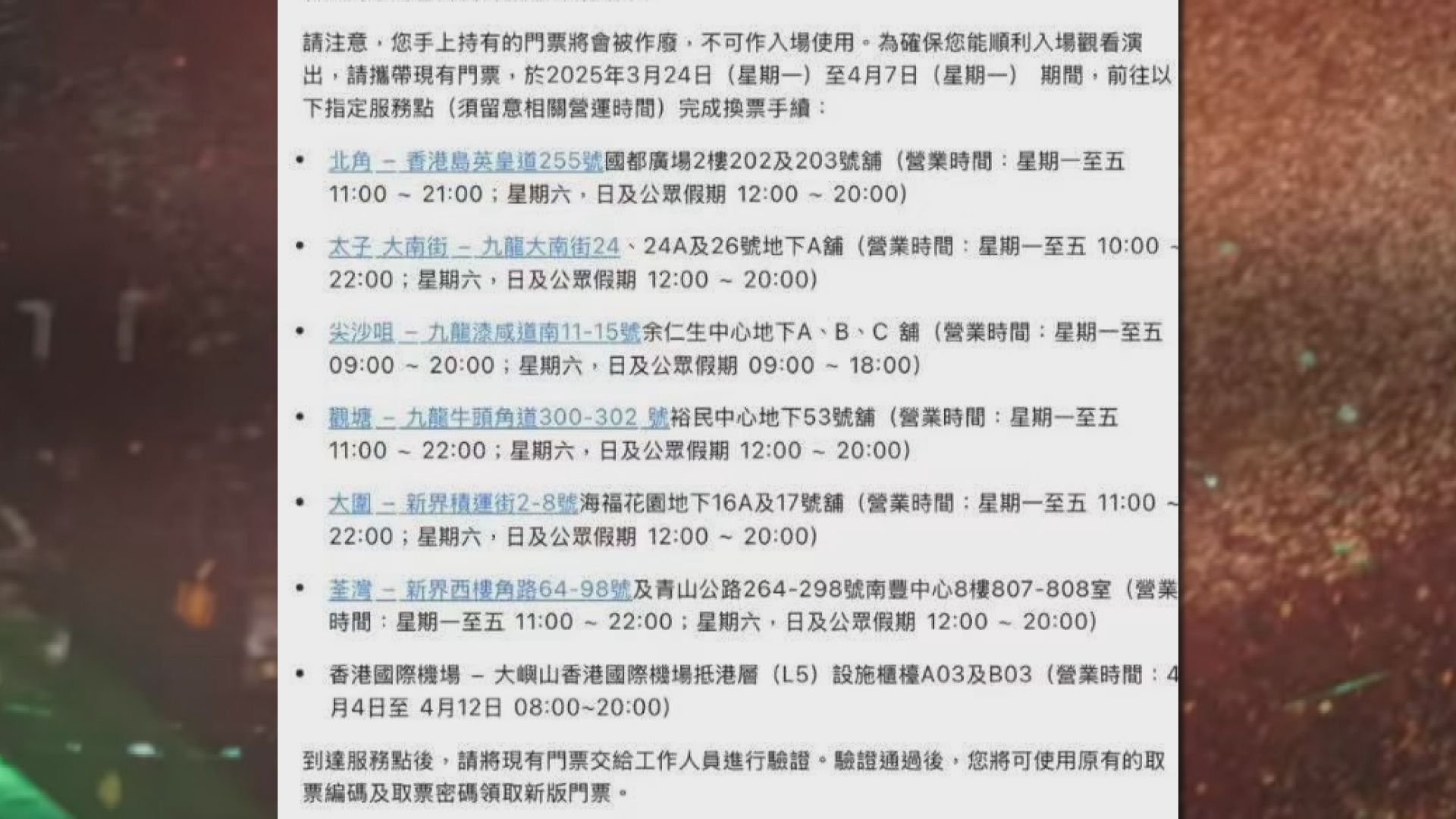 【Now新聞台】Coldplay演唱會疑印錯門票要求觀眾更換,Cityline周六(3月22日)晚就事件致歉,並新增廣州及深圳兩個換票地點。持票觀眾可於3月24日至4月7日,到香港7個地點或廣州及深圳的指定指點更換門票,地點及時間詳情如下: