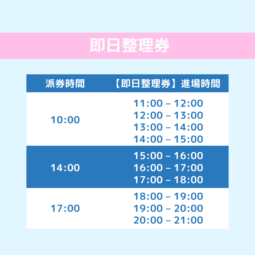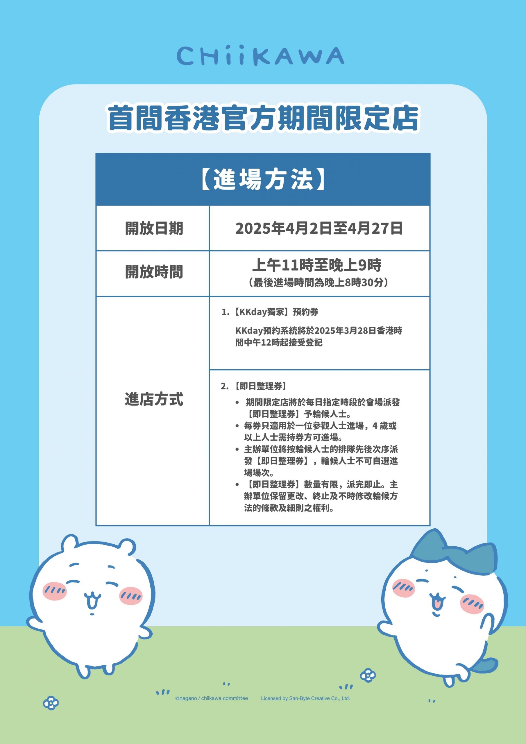 為減少排隊時間,由3月28日(五)中午12時起,粉絲可於KKday平台領取「預約券」。而期間限定店亦會於每日指定時段於會場派發「即日整理券」,每節入場時間為60分鐘。即睇入場詳細安排。