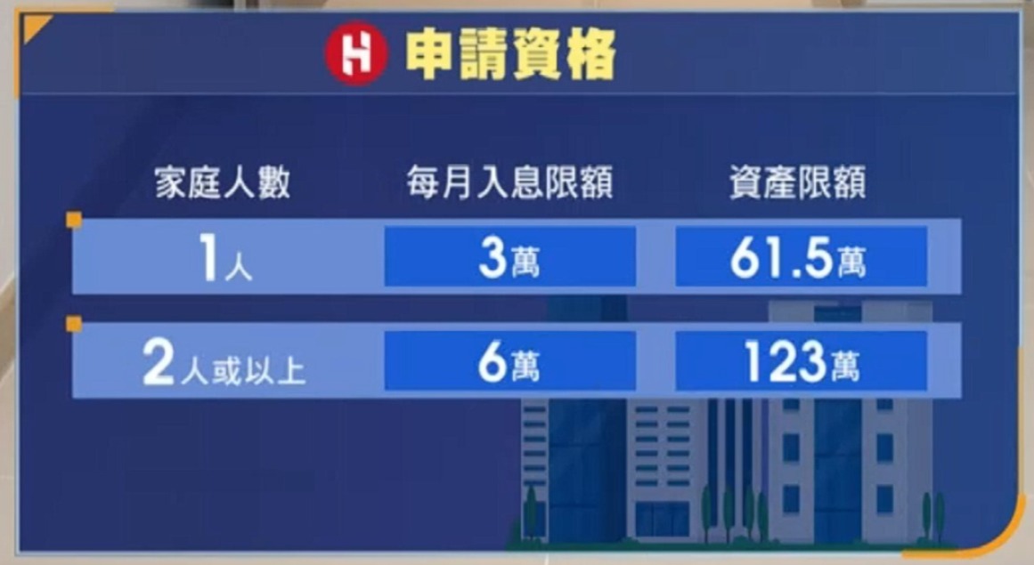 申請詳情:房協或房委會公屋租戶「綠表」可申請,白表設入息及資產限額(按此)
