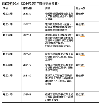 必須留意的是,以下資料僅供參考,不代表今年實際收生分數。同時各大學課程計算收生分數時,不同文憑試科目加權比重的計算方法也有不同,即使考生最佳5科考獲相關成績,不等於一定能入讀有關科目,詳情可參閱各間大學官網。