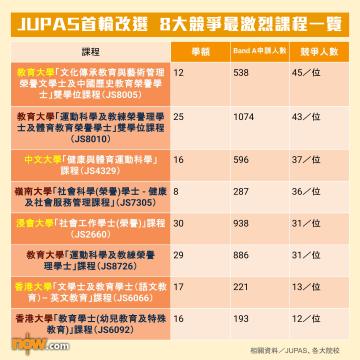 第一位為教育大學的「文化傳承教育與藝術管理榮譽文學士及中國歷史教育榮譽學士」雙學位課程(JS8005),共538人競爭12個學額,約45人爭一個學額。