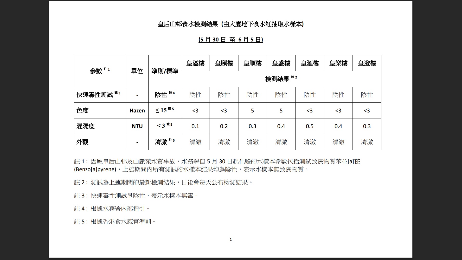 皇后山邨及山麗苑食水品質 水務署5月30日至6月5日檢測報告全文睇晒 皇后山邨及山麗苑食水品質 水務署5月30日至6月5日檢測報告全文睇晒 2025年6月6日 14:49 【Now新聞台】粉嶺皇后山邨及山麗苑上周五起食水出現黑點,引發市民對食水安全隱患的憂慮。水務署發布5月30日至6月5日期間食水檢測報告,詳情如下: 皇后山邨食水檢測結果: 山麗苑食水檢測結果: