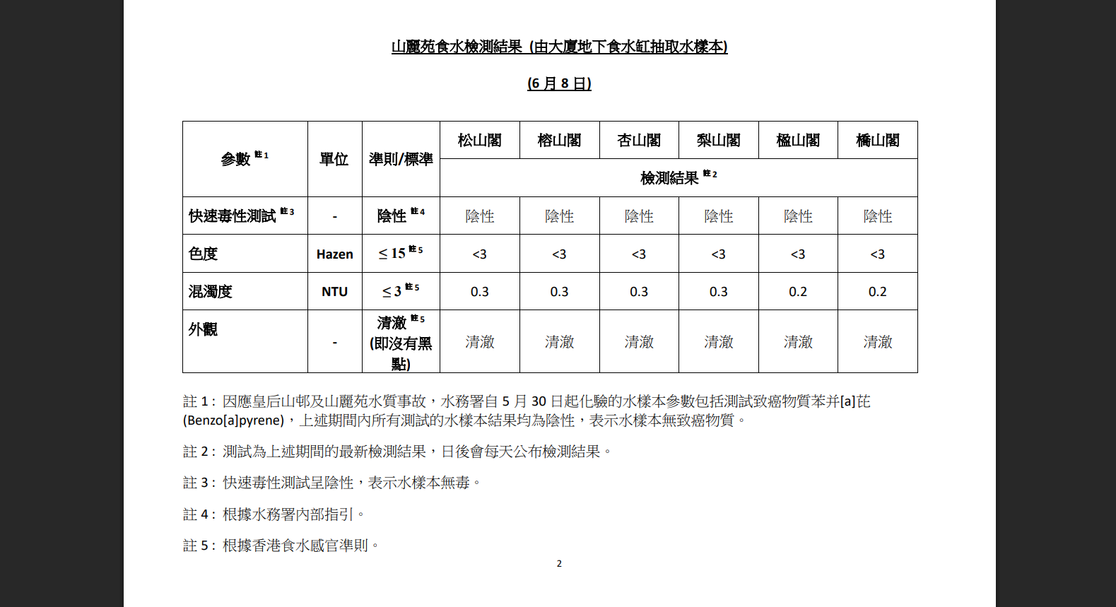 皇后山邨及山麗苑食水品質 水務署6月8日檢測報告 皇后山邨及山麗苑食水品質 水務署6月8日檢測報告 2025年6月9日 07:43 【Now新聞台】粉嶺皇后山邨及山麗苑5月30日起食水出現黑點,引發市民憂慮食水安全。水務署發布最新6月8日食水檢測報告,詳情如下: 皇后山邨食水檢測結果: 山麗苑食水檢測結果: