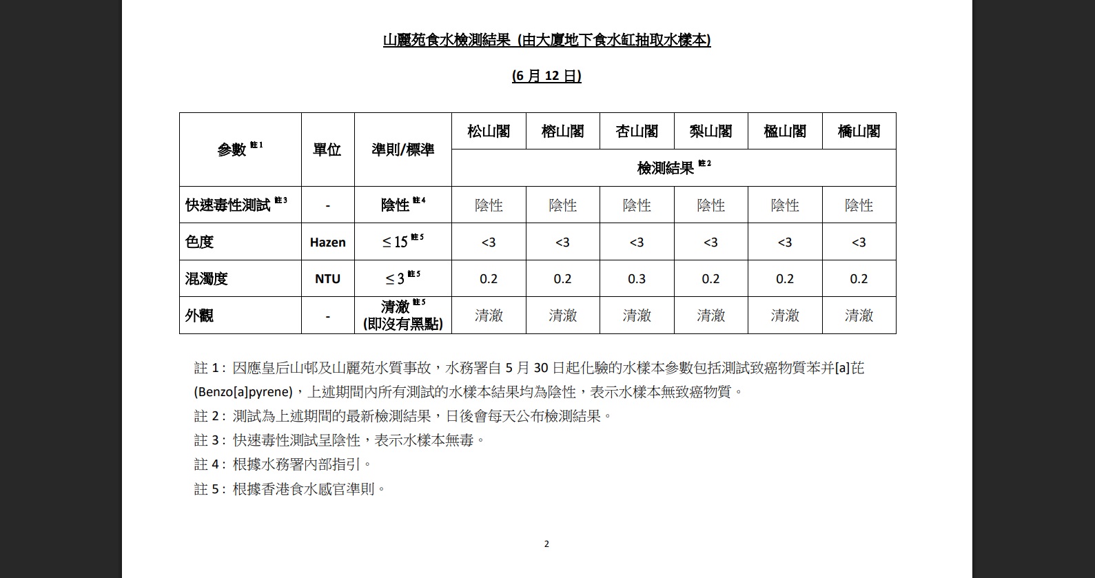 皇后山邨及山麗苑食水品質 水務署6月12日檢測報告