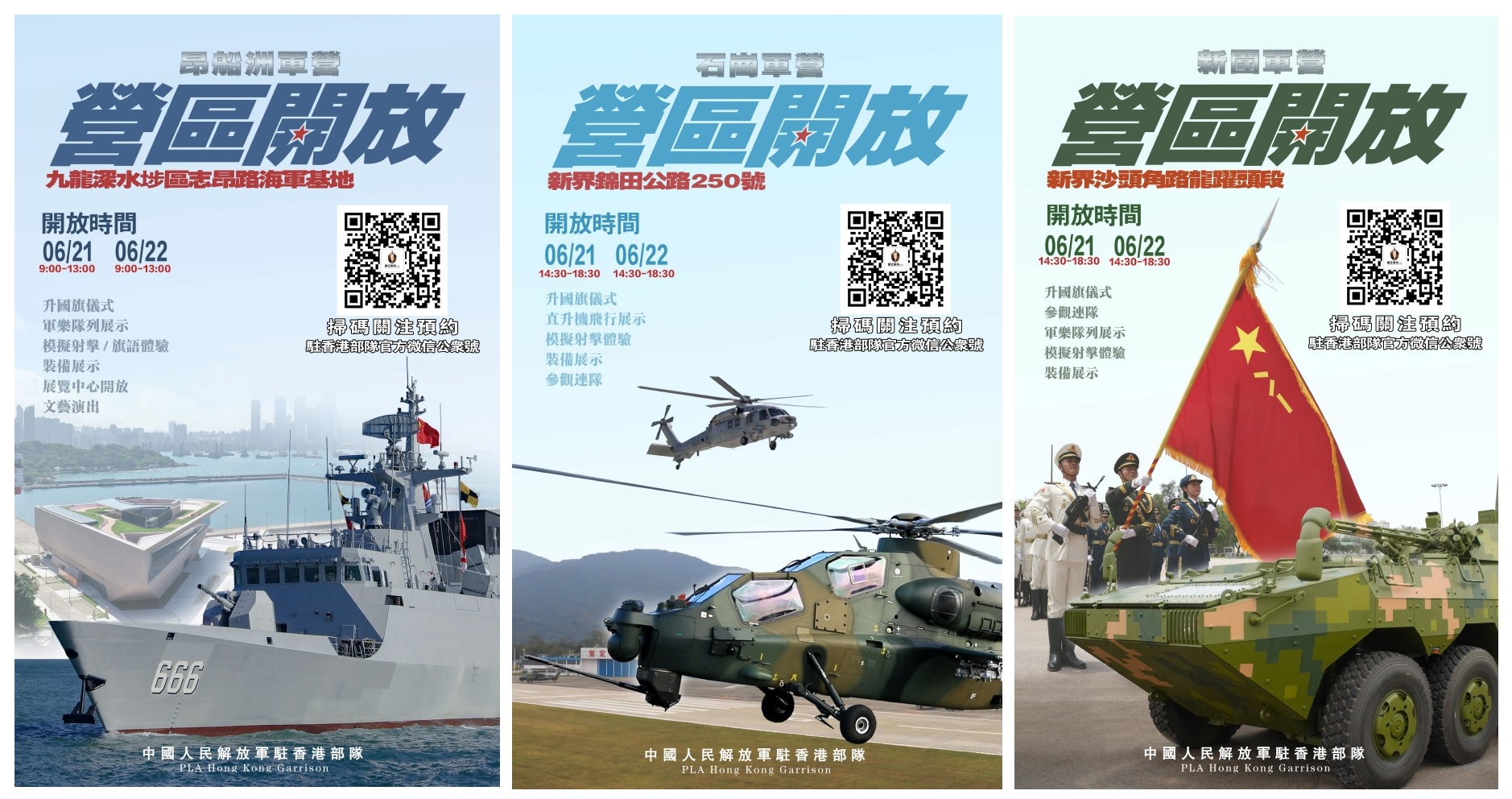 【Now新聞台】為慶祝香港回歸28周年,同時亦是解放軍進駐香港28周年,駐香港部隊將舉行軍營開放活動讓市民參觀,相關詳情如下: