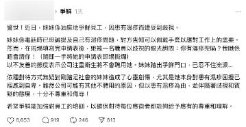 事件引起網民熱議,有人質疑事件是否屬實,亦有網民提供治療方法,稱願意向樓主妹妹推介工作。帖主回覆指公開此事只為其妹抱不平,並非想要賠償。