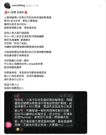 該名網民在社交平台Threads發帖,稱7月初收到可疑來電,對方要求事主還款,更說出事主的全名及地址,「佢話我有筆數未還,仲講咗個時間話轉頭揸車過來收條數」。