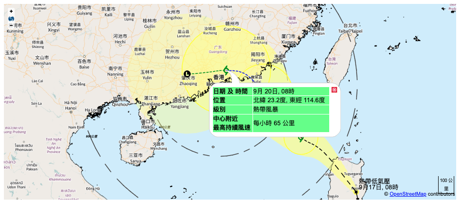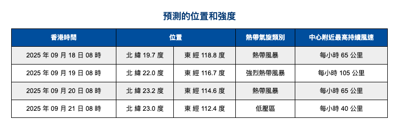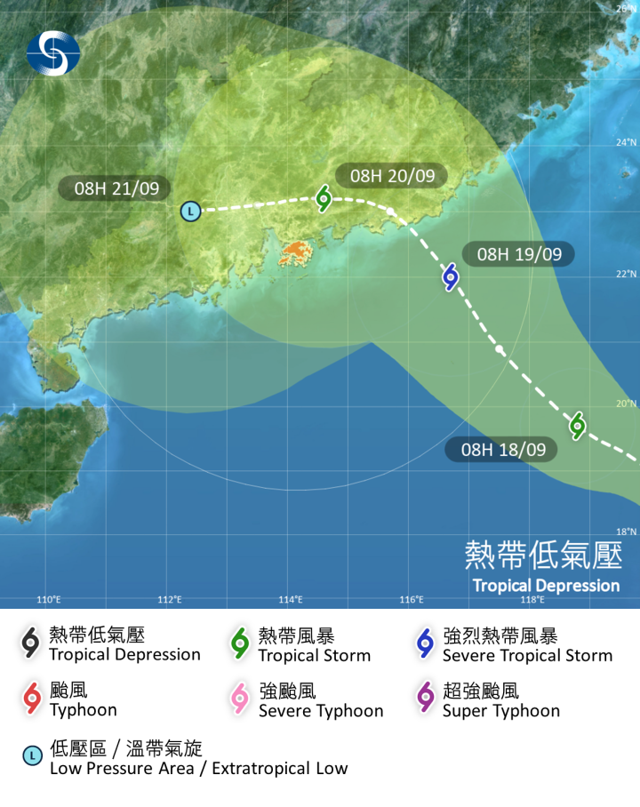 根據天文台熱帶氣旋路徑圖,該熱帶氣旋在今晚(9月17日)進入本港800公里範圍,9月18日增強成熱帶風暴,並進入本港600公里範圍;9月19日早上8時至9月20日早上8時以強烈熱帶風暴級別進入香港東面約300公里範圍內,其中心附近最高持續風速將升至最高每小時105公里;並在9月20日以熱帶風暴級別橫掃香港北面約100公里、東莞市附近;最終在9月21日早上於肇慶市附近登陸。