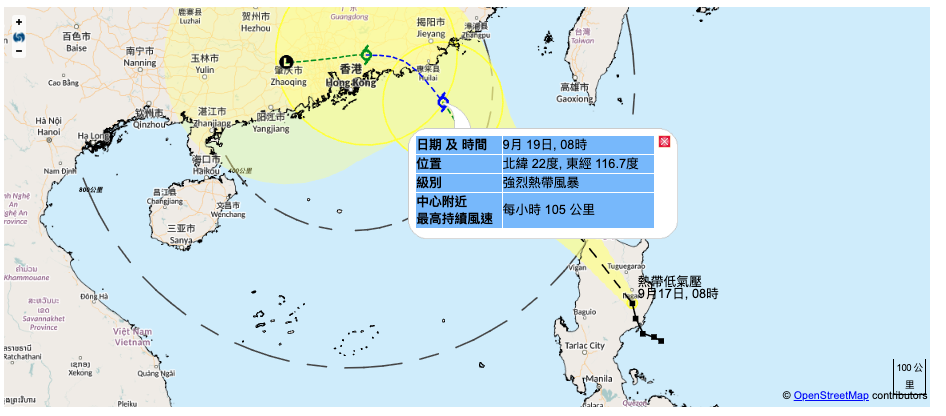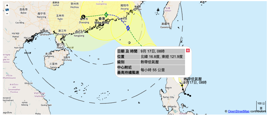【Now.com】周末又打風!天文台指,位於呂宋附近的熱帶氣旋會在今日(9月17日)橫過呂宋一帶並進入本港800公里範圍,將在今晚發出一號戒備信號;料該熱帶氣旋在周五(19日)增強為強烈熱帶風暴,最接近本港時於北面約100公里橫掃,其風力將持續至周末。