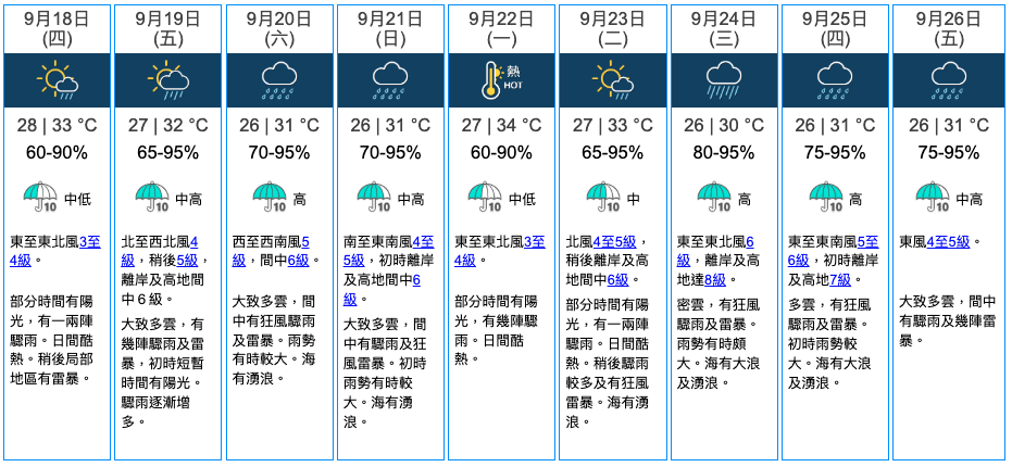 本港天氣方面,天文台表示,星期四部分時間有陽光,日間酷熱,但仍有一兩陣驟雨;星期五驟雨逐漸增多,周末期間有狂風驟雨及雷暴,雨勢有時較大,風勢頗大,海有湧浪。