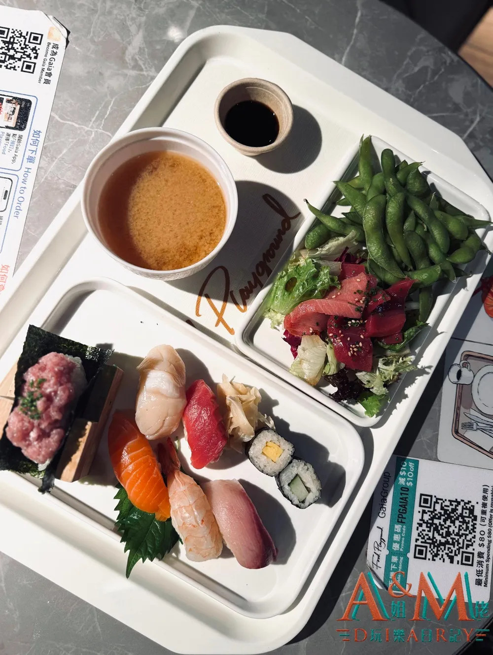 套餐份量十足,除咗Oomaki招牌自創名物手卷,更有手握壽司、拖羅刺身、沙律菜、枝豆以及麵豉湯。其中Oomaki嘅自創手卷賣相精美,以一個U型木盒裝住,揀咗吞拿魚作餡,加上白飯以及新鮮脆口嘅紫菜,口感一流,令人回味無窮;刺身有齊赤身同拖羅,兩款都非常新鮮;喺foodcourt嘅手握壽司竟然係由職人壽司師傅即叫即做,極具誠意。