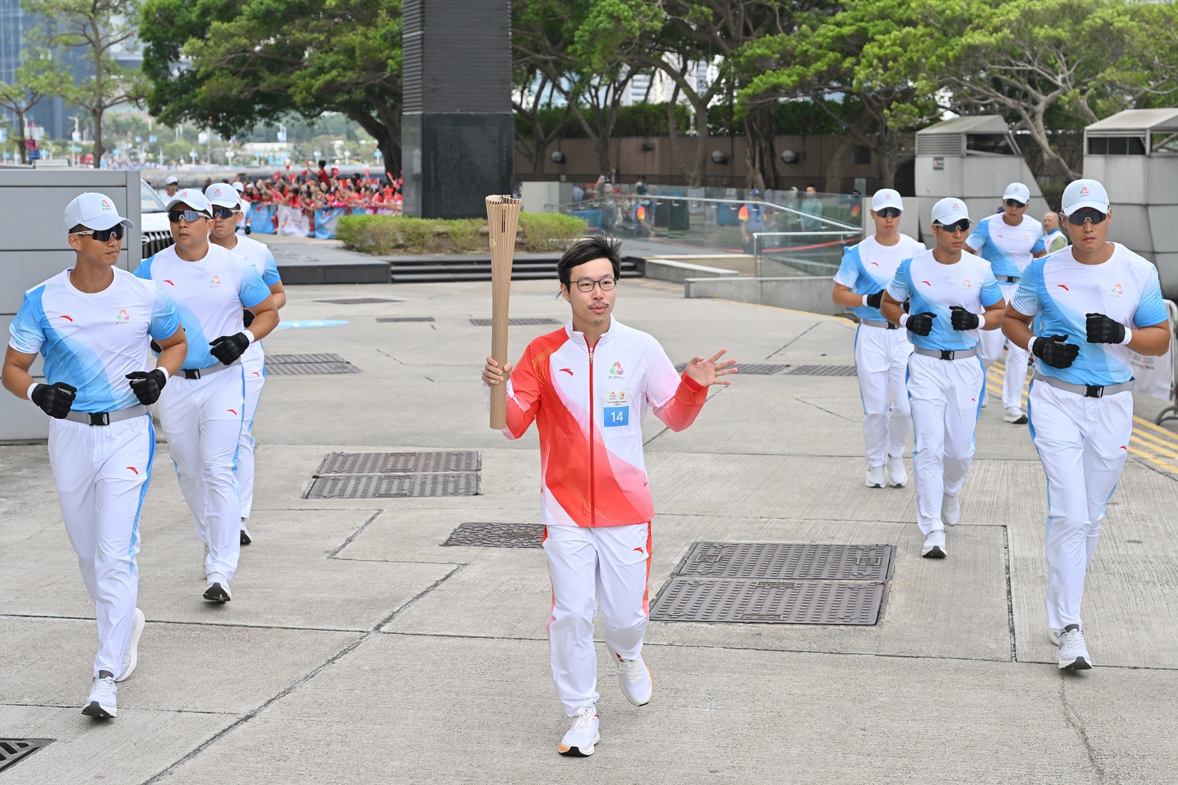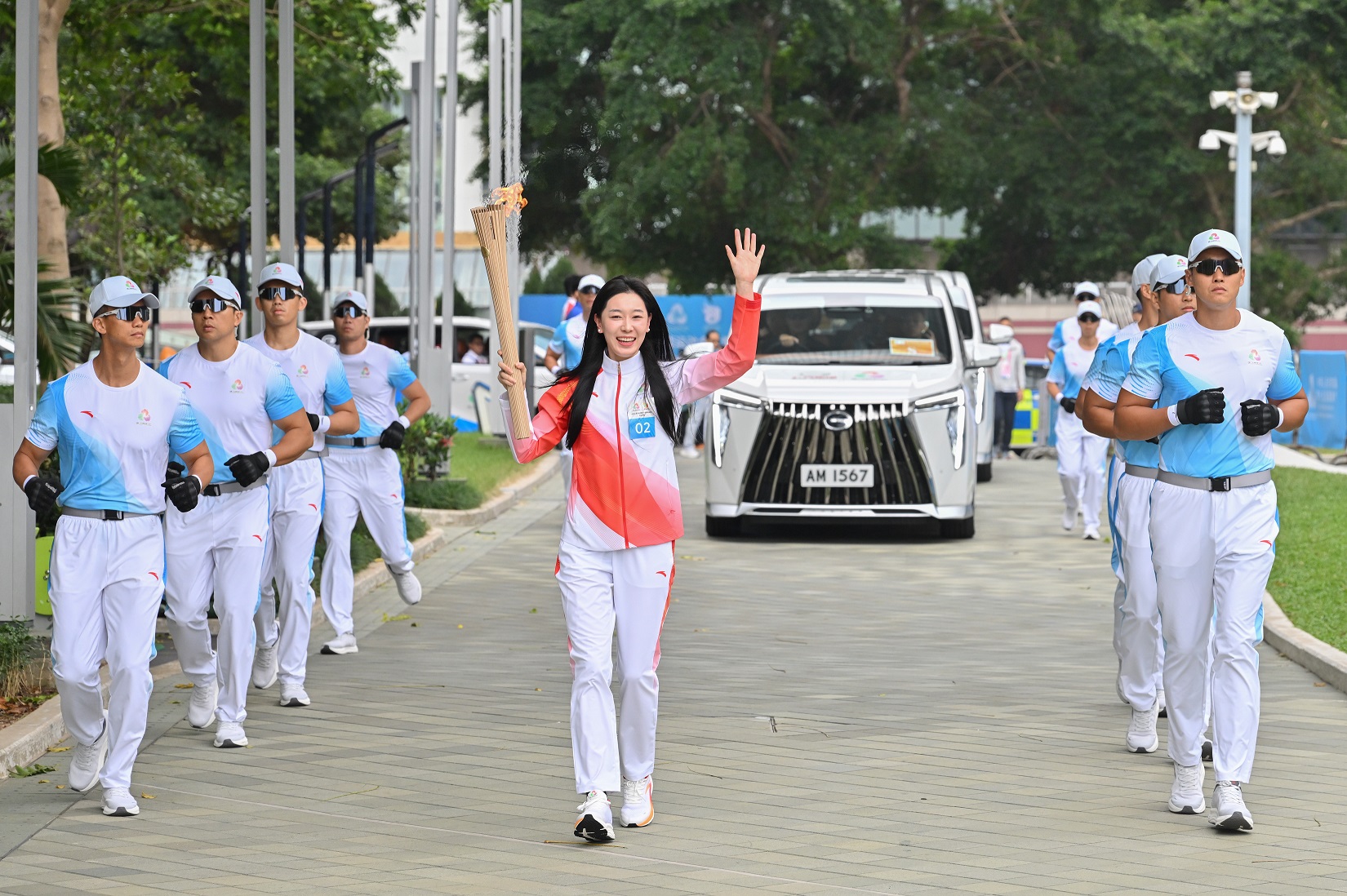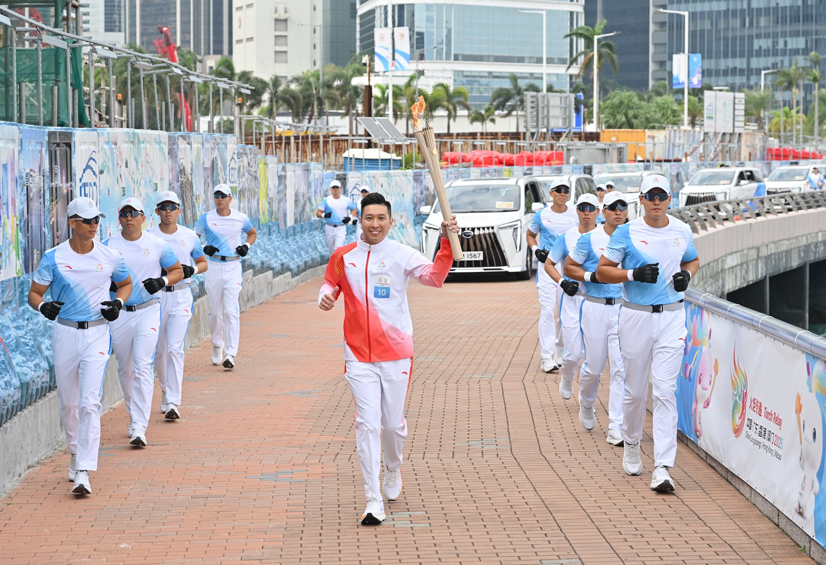 隨著文化體育及旅遊局局長羅淑佩用火種棒燃點火種盆,並由陳國基點燃火炬棒,再交由第一棒火炬手、香港乒乓球代表黃鎮廷,正式展開香港賽區的火炬接力傳遞,最終送抵啟德體育園中央廣場,再由最後一棒、世大運金牌得主、港隊女子重劍代表佘繕妡點燃火盆完成傳遞。