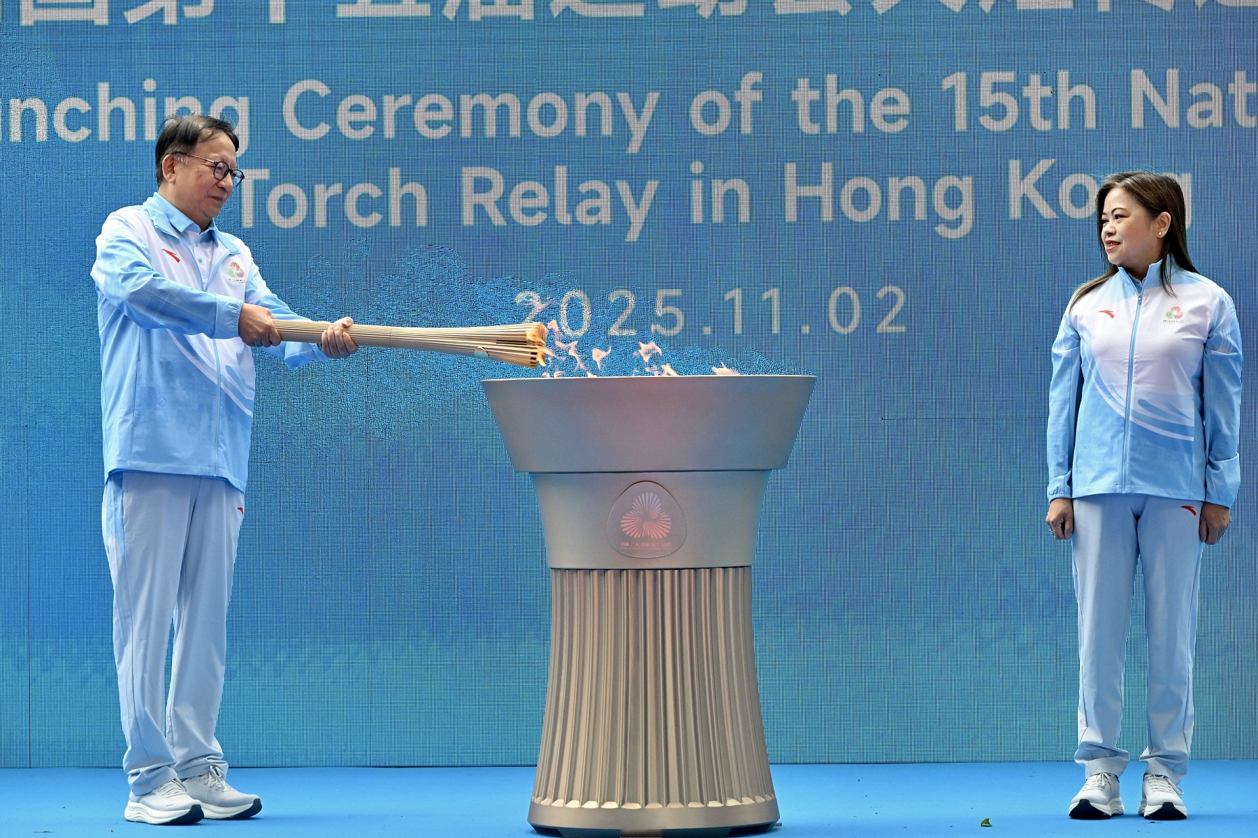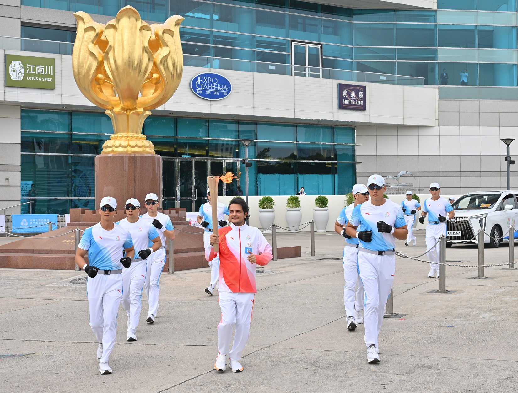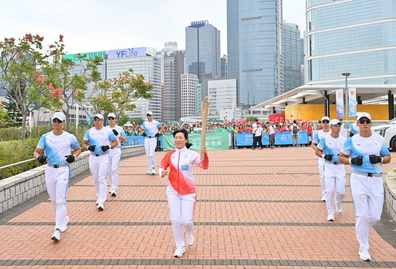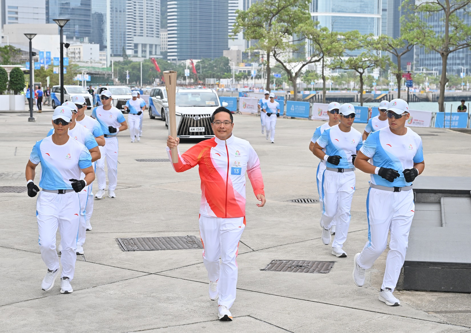 隨著文化體育及旅遊局局長羅淑佩用火種棒燃點火種盆,並由陳國基點燃火炬棒,再交由第一棒火炬手、香港乒乓球代表黃鎮廷,正式展開香港賽區的火炬接力傳遞,最終送抵啟德體育園中央廣場,再由最後一棒、世大運金牌得主、港隊女子重劍代表佘繕妡點燃火盆完成傳遞。