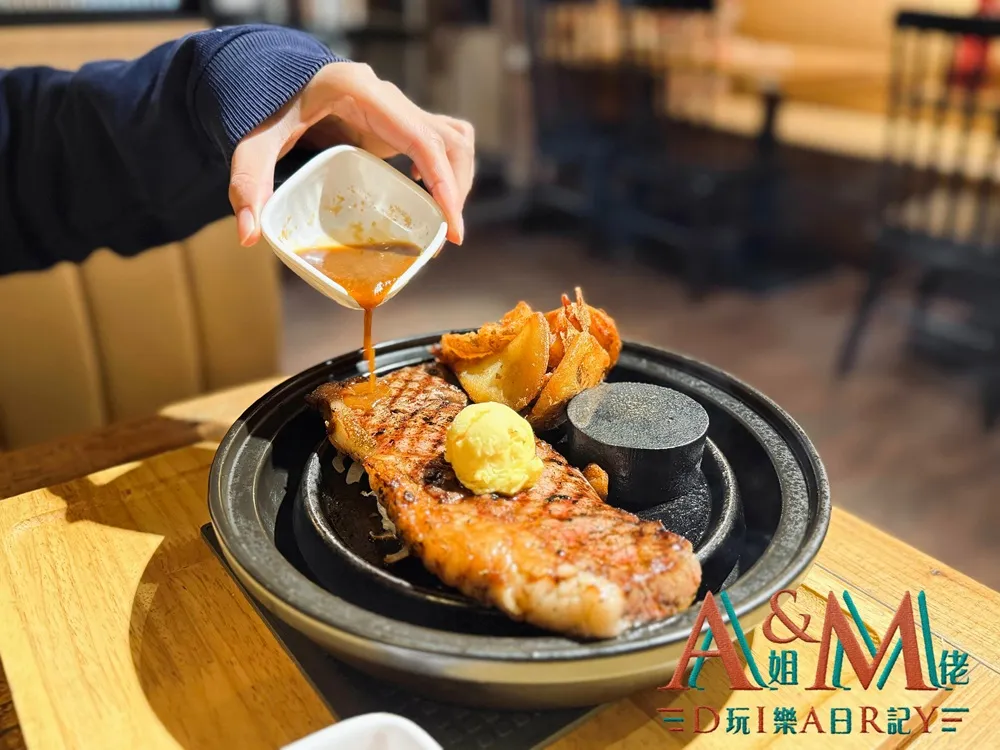 西冷牛扒用上熱石承載,除咗熱力更均勻之外,牛扒嘅生熟度亦可以隨心所欲。西冷牛扒肉味香濃,肉質結實但不會太韌,所有嘢都啱啱好!