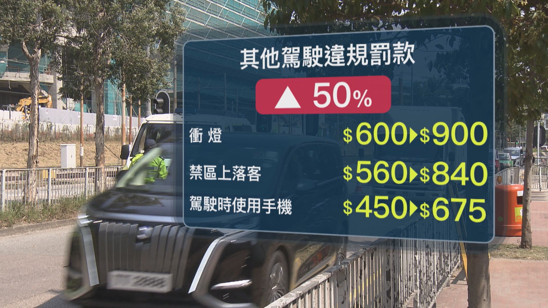 *違例泊車定額罰款(牛肉乾),由320元調高至400元,超速、無牌駕駛、未禮讓行人、上落客超時等19項定額罰款,由現時320元至1000元不等調高至480元至1500元不等。