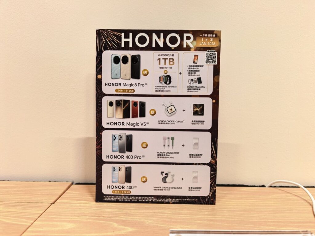 位於屯門 V city 的新門市由即日起至 1 月 21 日舉行「超值搶購週」,每日均提供特定產品進行限量促銷。首日(1 月 14 日)率先推出原價 HKD2,299 的HONOR X9c Smart,特價僅需 HKD999;隨後幾天亦有 HONOR Watch 4、CHOICE Watch 2 Pro 等穿戴設備以低價發售。此外,備受注目的 HONOR Earbuds X6 及 SuperCharge 快速充電組合,分別於 1 月 19 日及整個搶購週期間提供震撼優惠,後者價格更低至 HKD19。