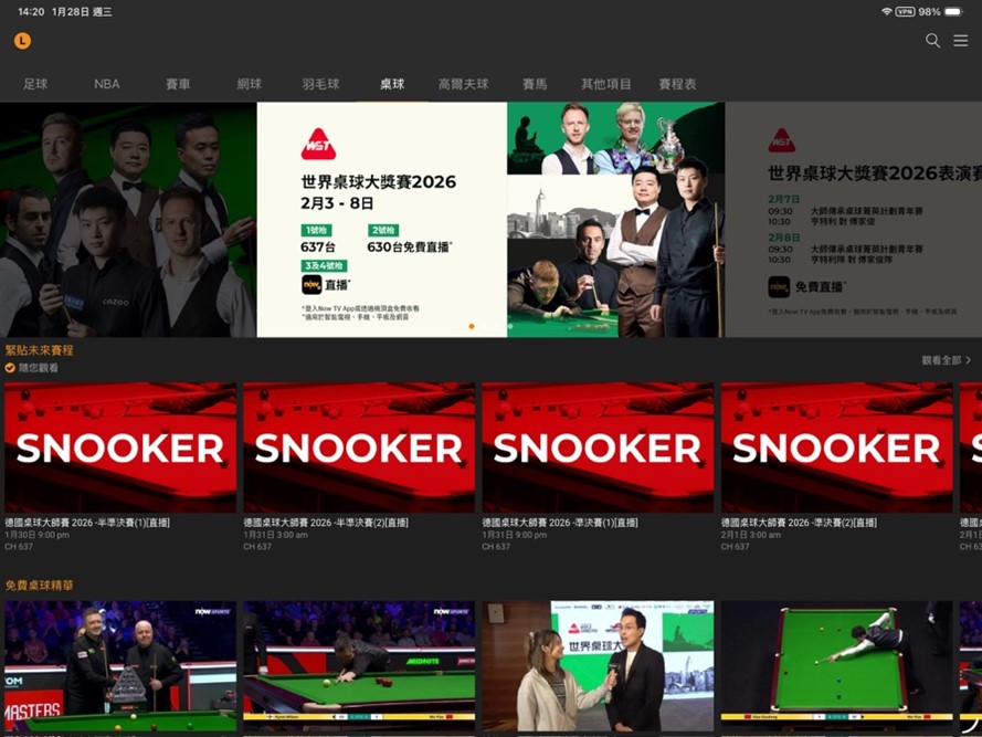 除了正賽,周六、日還有傅家俊與「桌球皇帝」亨特利領銜的表演賽,以及「大師傳承桌球菁英計劃」青年賽,同樣會在 Now TV 637 台及 Now TV App 免費直播,適合一家大細一齊感受現場氣氛。對於喜歡用手機、平板或智能電視睇波的用家,Now TV App 亦支援在多個球檯直播之間快速切換,配合彈出式資訊和節目時間表,隨時由 1 號檯的準決賽跳去 3 號檯的年青球手激戰,再回到決賽主檯,操作上與打機換視角一樣直覺。