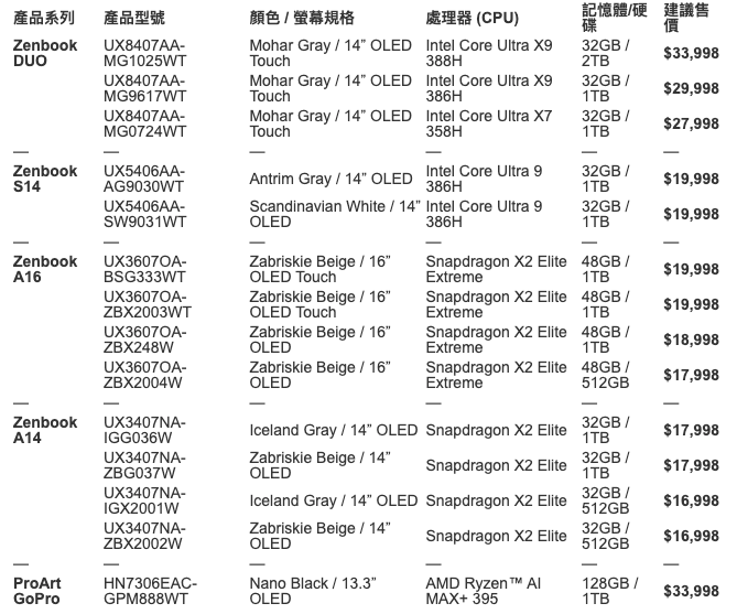 至於追求「極致輕量」的 Zenbook A14,機身重量僅為 990g,並搭載 Snapdragon X2 Elite 處理器,AI 算力高達 80 TOPS,其驚人的 33 小時續航表現,是目前市面上跨日使用的理想選擇。今年更首度加入 16 吋的 Zenbook A16,讓用戶在享受大螢幕視覺的同時,僅需負擔傳統 14 吋筆電的重量。