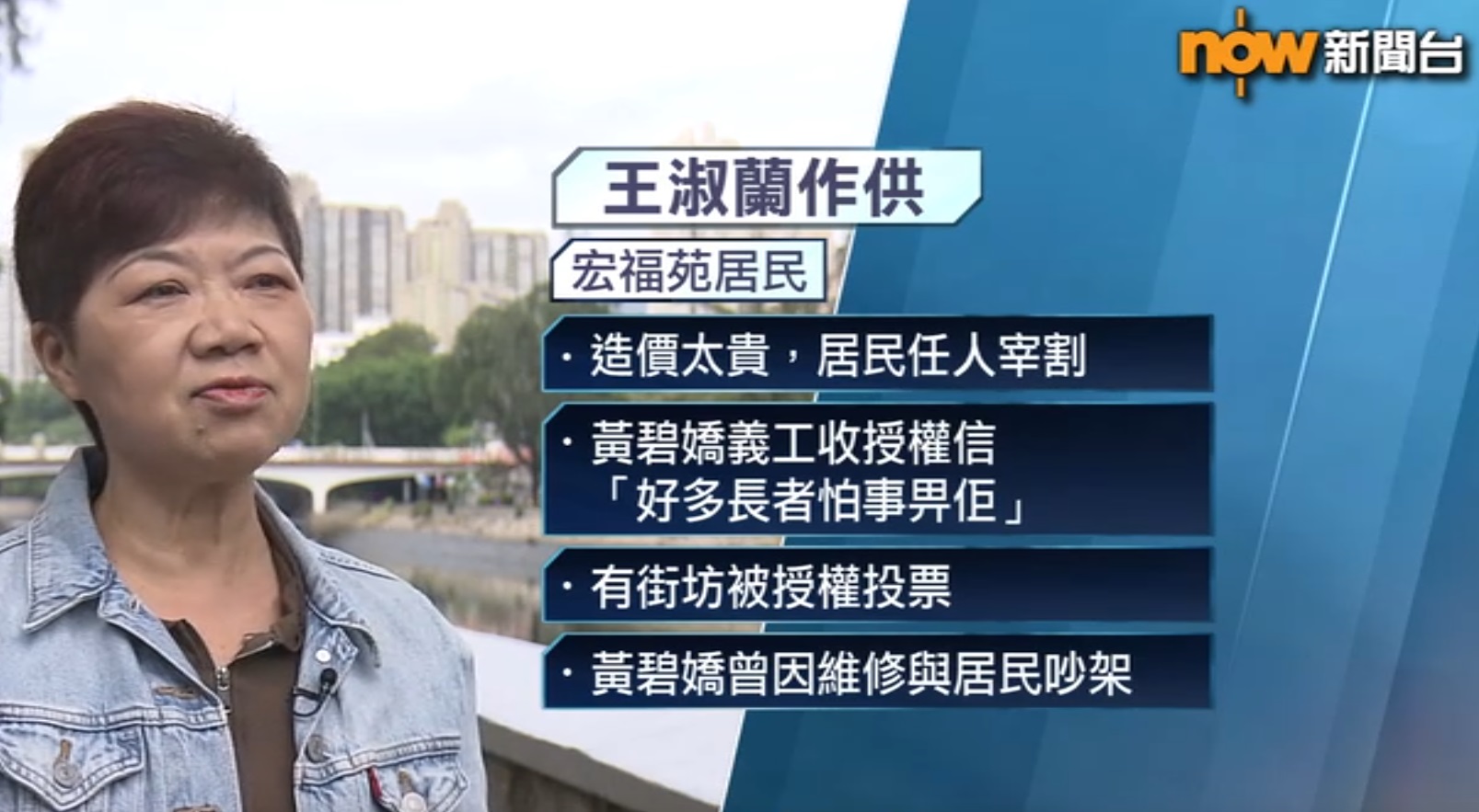 宏志閣居民王淑蘭:「她進來吵架,我不明白她想參與甚麼,又不是進來為我們付款。有甚麼事情我們街坊自行解決,以及很多她們的義工在屋苑,我們很多時很難說話,會給別人罵。有時可能只是談論招標書上看到某些事情時,別人不同意已經會罵我們。」