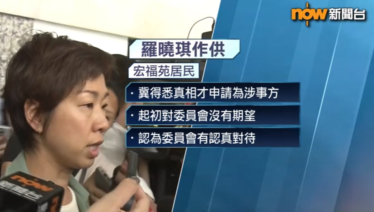 宏昌閣居民羅曉琪:「有些已拒絕出席的,都很失望,例如鴻毅以及宏業,以及議員黃碧嬌,我相信所有大家都知道的名單,大家都對他們有期望,大家都認為不是不出來為自己辯解吧?還有房屋局獨立審查組(被)點名『通水』,我認為他們可以自己出來解釋一下。我們給予他個機會親自辯解,不要大眾揣測,未審先判。」