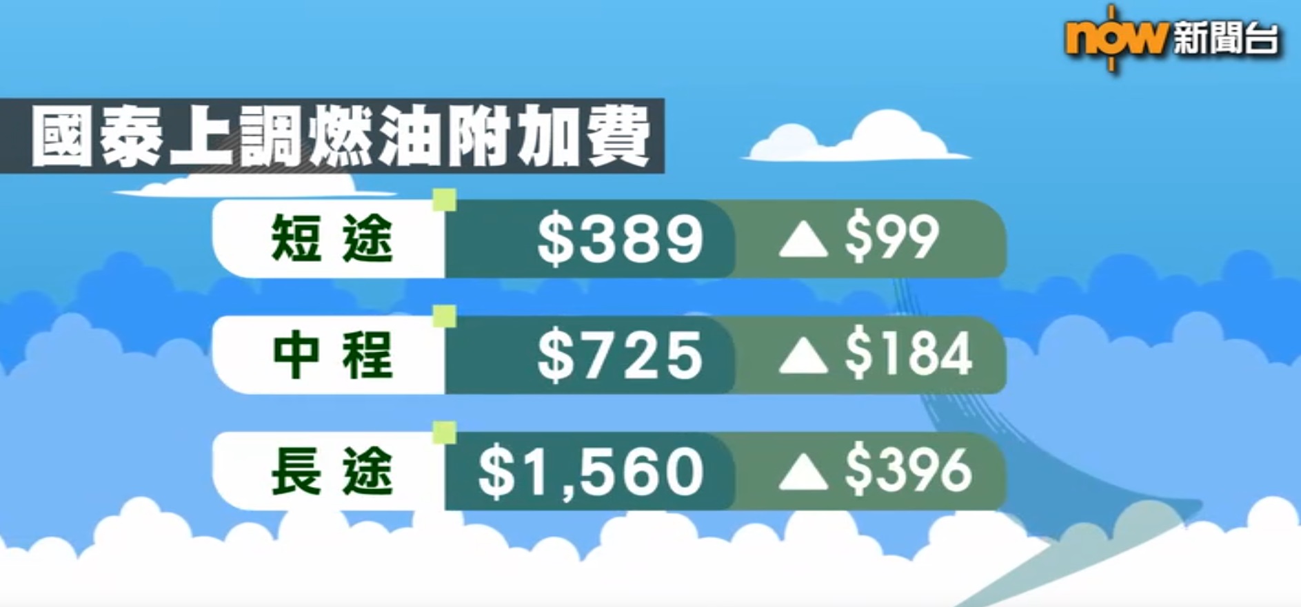 大灣區航空宣布,下周三起,香港往台北、日本及泰國等主要航線的客運燃油附加費上調至389元。國泰航空日前亦宣布,短、中、長途的航班,將加至389元至1560元;旗下的香港快運,由香港往海外航點亦加至389元。