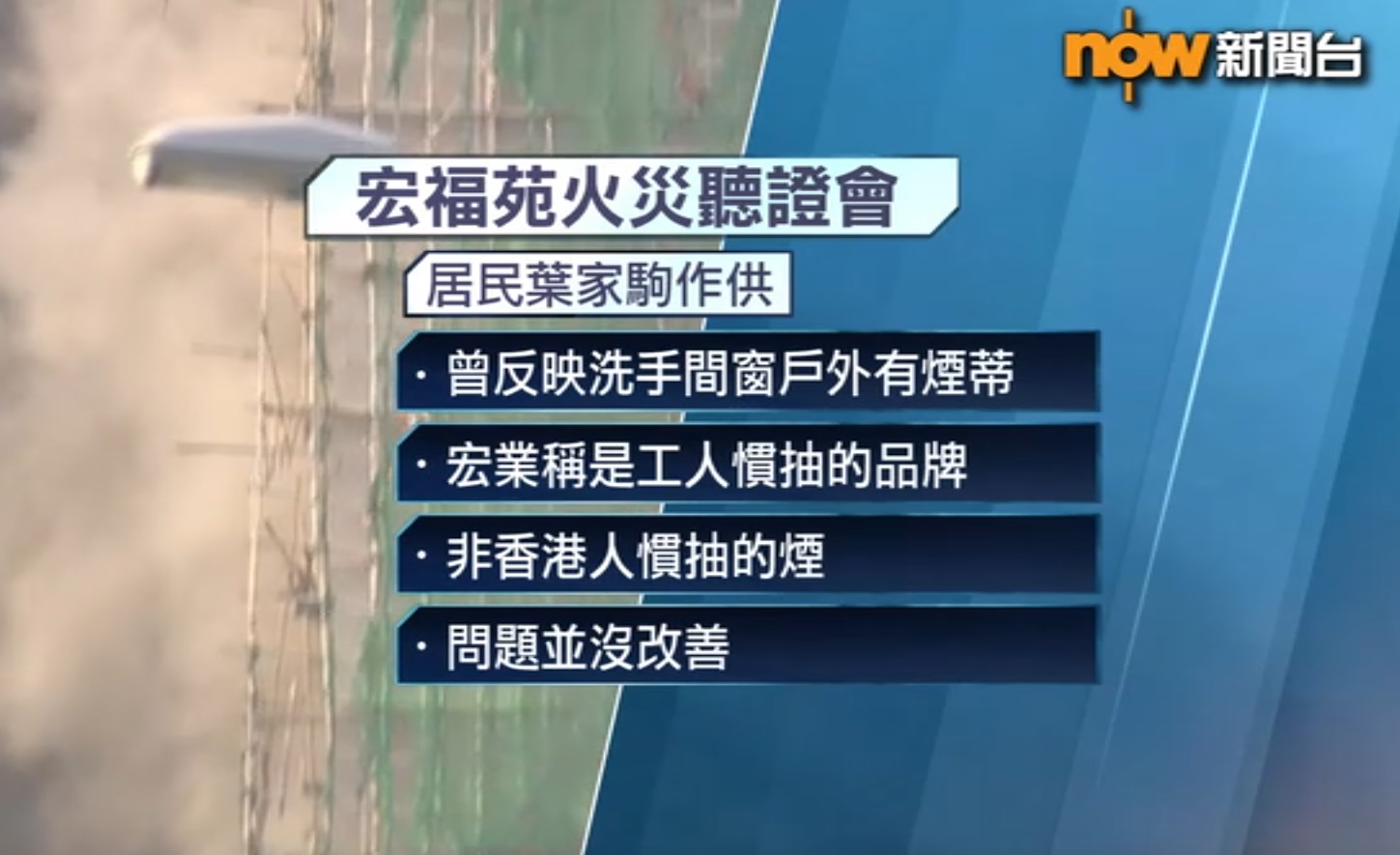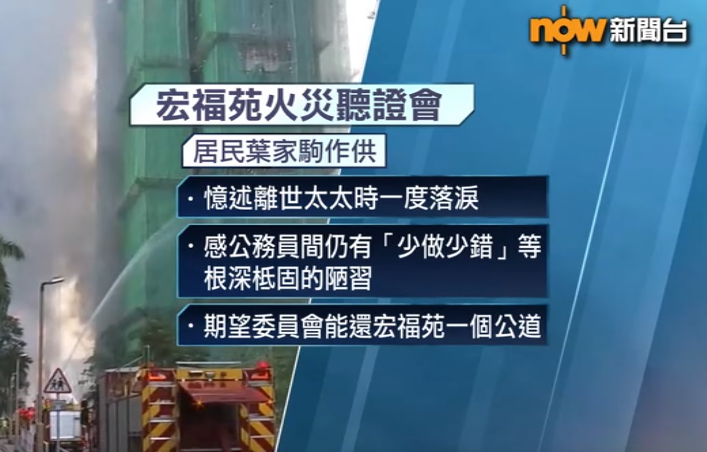 【Now新聞台】宏福苑火災獨立委員會舉行第五場聽證會。有宏泰閣居民作供指,曾向宏業建築反映窗外有煙頭、新棚網物料薄,但對方都沒跟進,又認為顧問公司鴻毅建築師嚴重偏袒宏業。