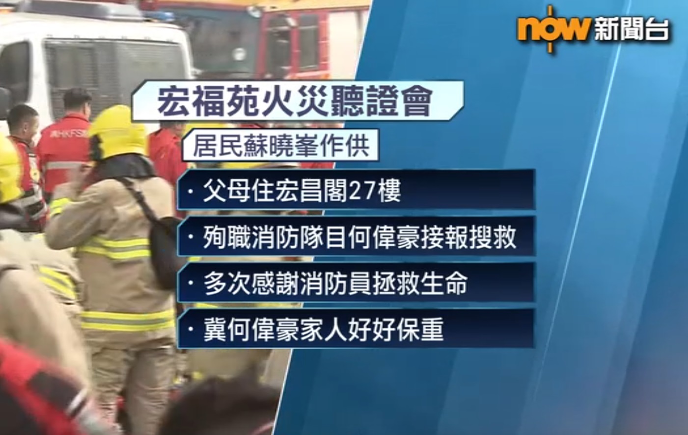 另一名作供的居民蘇曉峯住宏志閣,父母住宏昌閣27樓,是殉職消防隊目何偉豪接報前往搜救的單位。他落淚道歉,又多次感謝消防員拯救生命,希望何偉豪的家人好好保重。