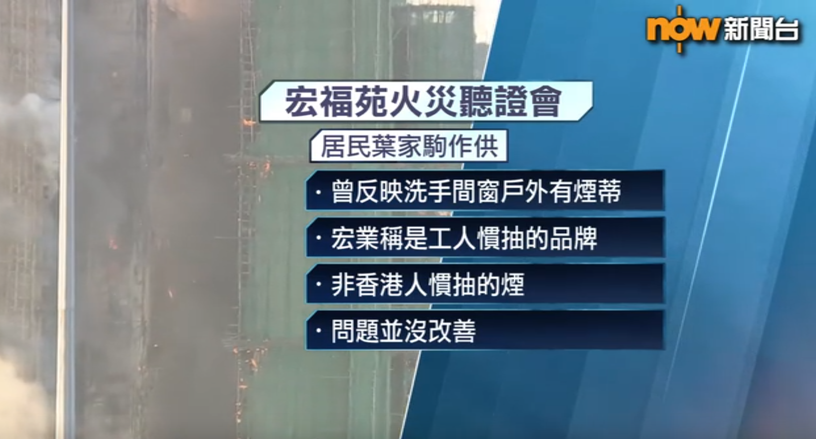 聽證會踏入第五日,首先作供的葉家駒住宏泰閣17樓,太太在大火中離世。他憶述去年2月曾向承建商宏業建築反映洗手間窗戶外有煙蒂,不是香港人抽開的煙,對方同意是工人慣抽的品牌,承諾會跟進,但之後問題無改善。