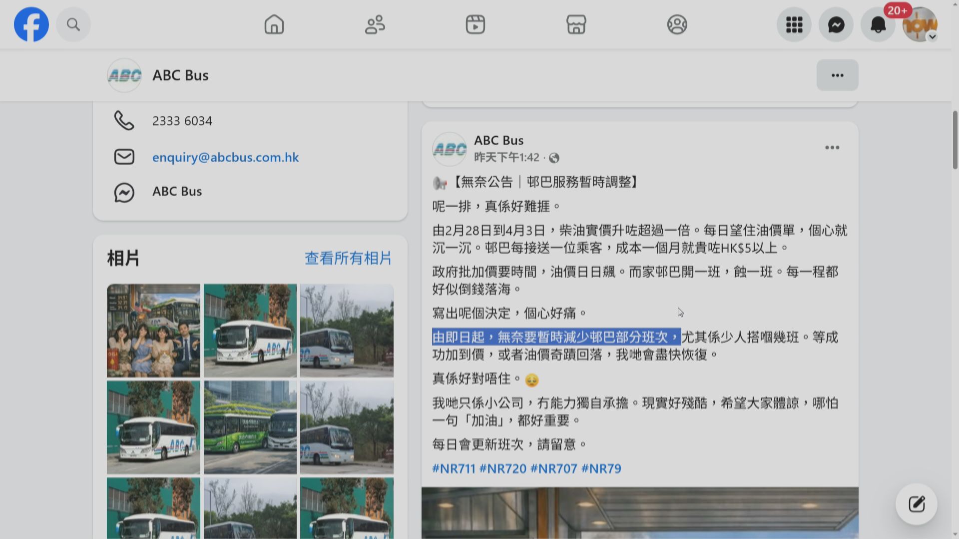 ABC巴士公司目前營運4條屯門區邨巴路線,公司在社交網站發文稱,油價由2月底至今升超過一倍,每接送一位乘客,一個月成本就貴了5元以上,形容為開一班、蝕一班,如同「倒錢落海」,即日起暫時減少部分班次,尤其是客量較少的幾班,待成功申請加價或油價回落後會盡快恢復,但如果問題無法解決,所有路線或要停駛,或徵收燃料附加費。