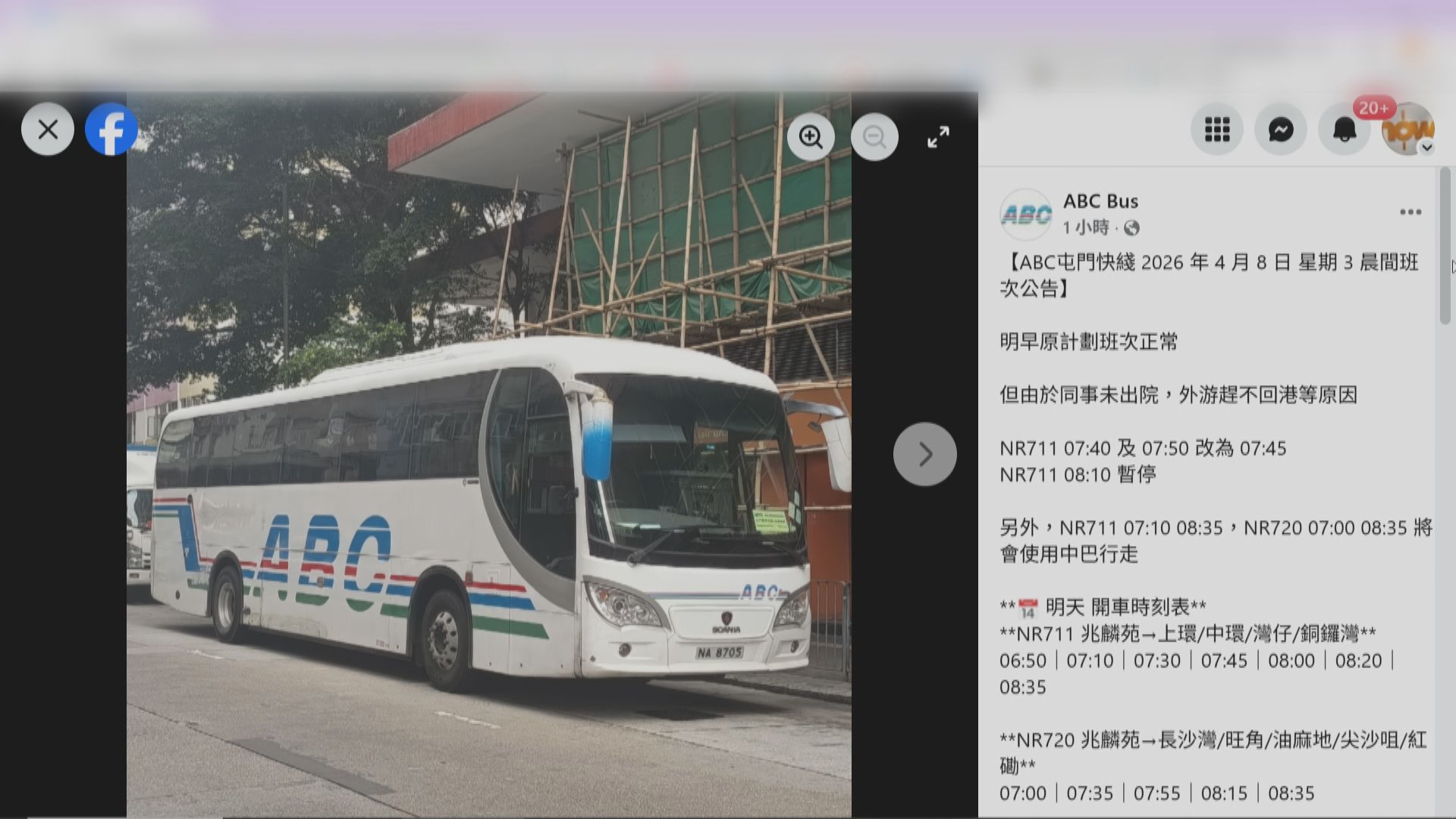 ABC巴士晚上在社交平台發文稱,由於有職員未出院、外遊趕不及回港等原因,兆麟苑開往灣仔的NR711早上7時40分及7時50分班次改為7時45分,而8時10分班次則暫停,另有4班車改用中巴行走。