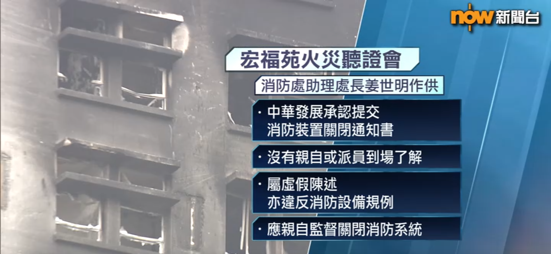 對於消防裝置承辦商中華發展承認提交消防裝置關閉通知書,但沒有親自或派員到場了解,姜世明認為中華發展做法屬於虛假陳述,亦違反消防設備規例,除了違法,亦非常要不得,他們要親自監督關閉消防系統。