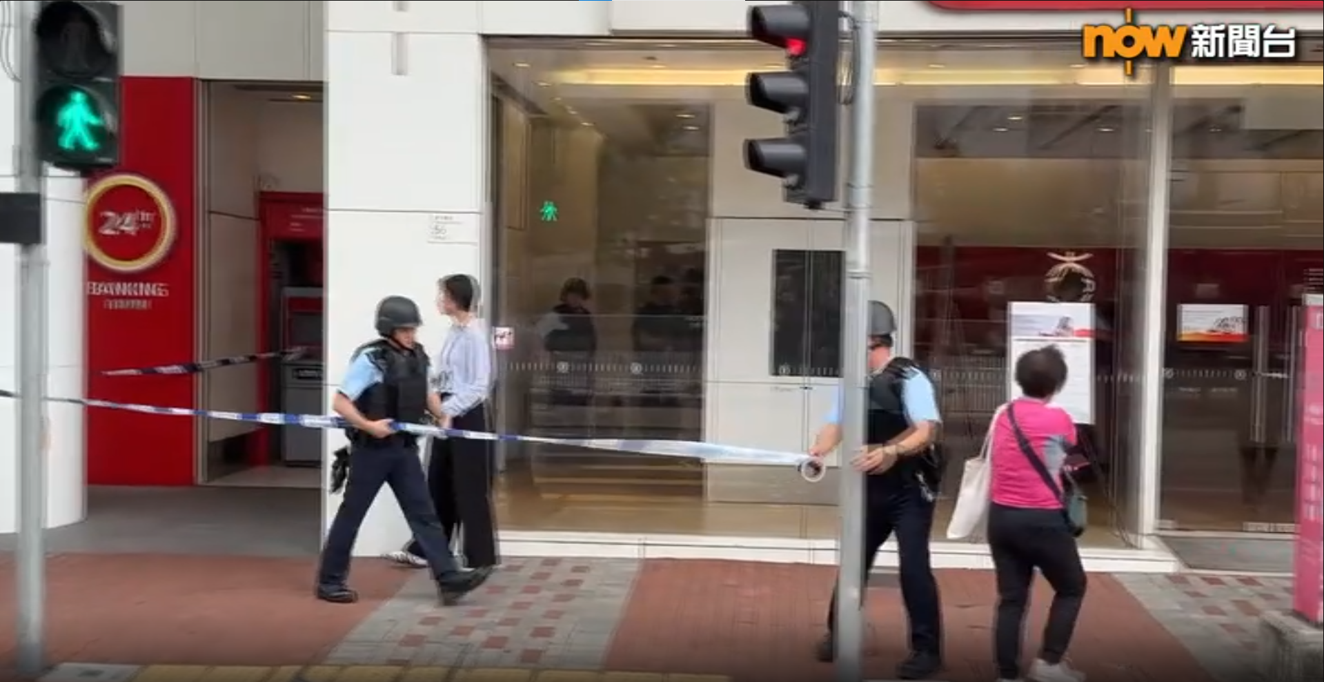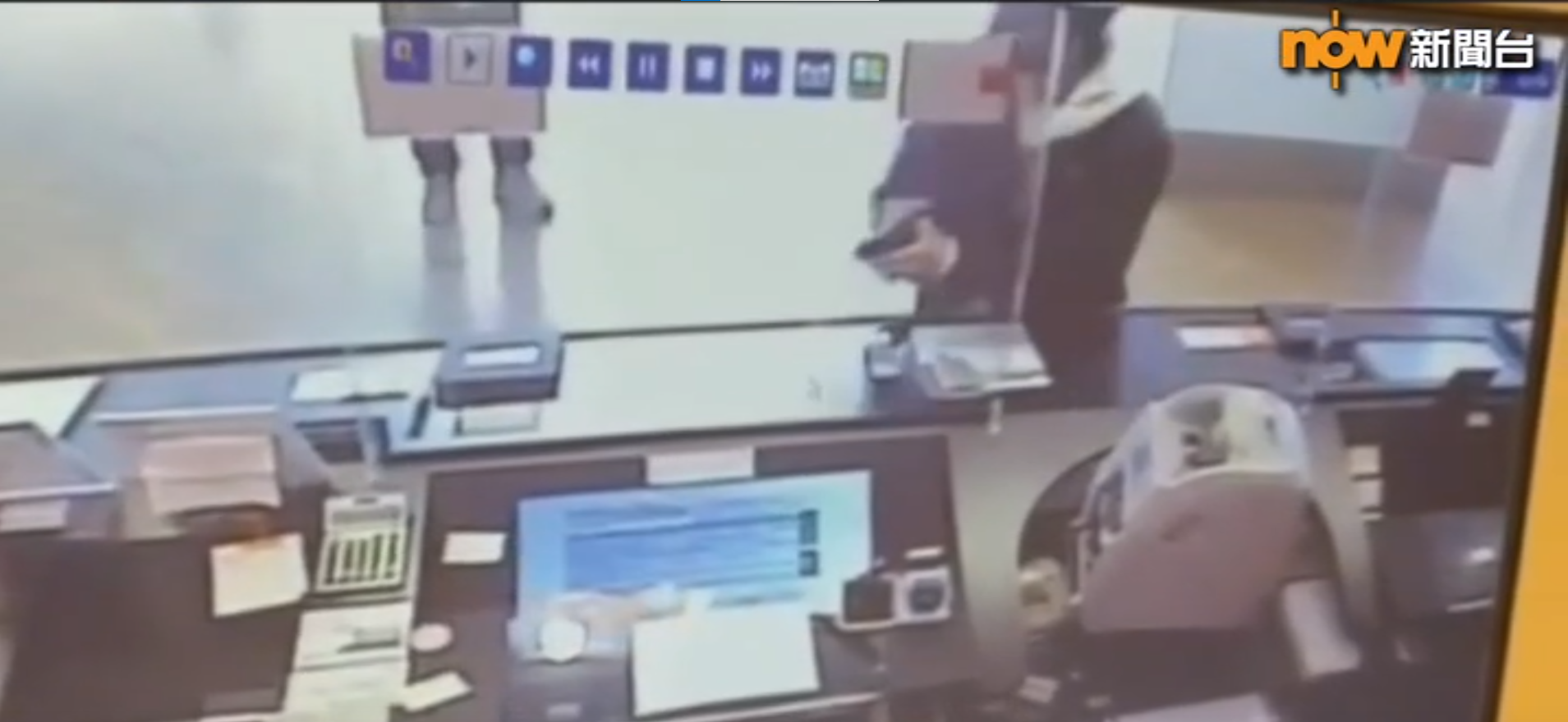 從網上閉路電視片段看到,中午12時許,一名身穿黑色外套的男子進入銀行後,取出疑似手槍指著一名女職員,原本在櫃位前的一名女子執拾文件走開,男子把一張紙放入櫃位內,之後再用鎚扑爆膠板,女職員嚇至一直躲在桌下,其後一名男職員前來,在櫃子內取出一疊現金交給男子。