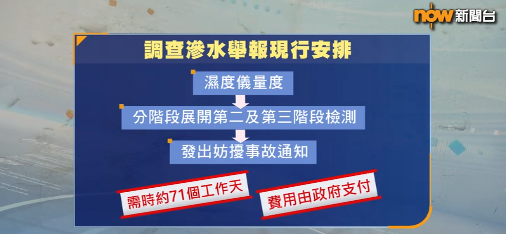 現時如果有滲水舉報,滲水辦會先用濕度儀量度,如高於35%就會分階段展開第二及第三階段檢測,包括排水管色水測試、地台蓄水測試、紅外線熱成像分析等,確定源頭後,發出妨擾事故通知,需時約71個工作天,檢測費用由政府支付。