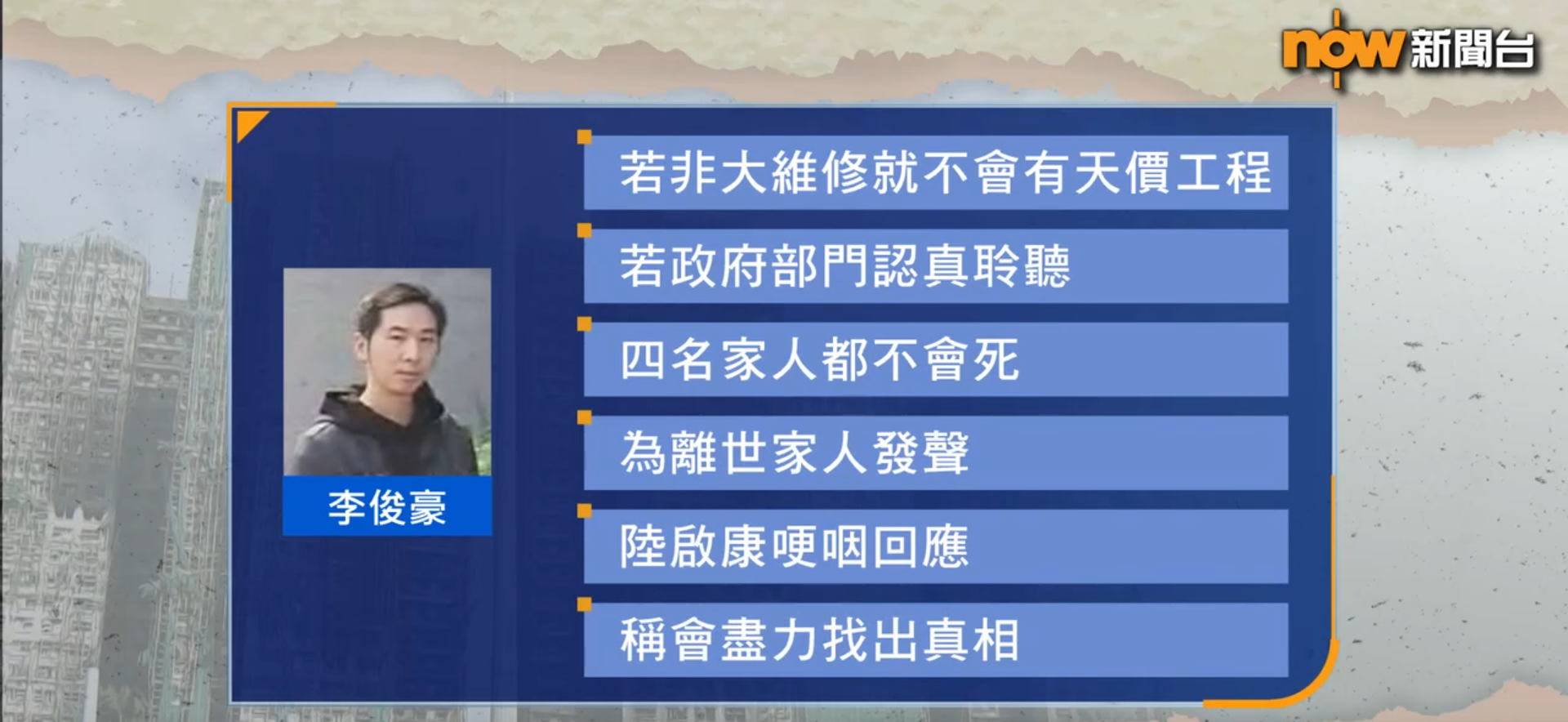 原居於宏泰閣的居民李俊豪亦在聽證會作供,他稱火災令他的媽媽、哥哥、15個月大的姪女及外傭離世,母親亦曾向宏業投訴棚網,宏業聲稱棚網合規有合規格證書。他母親亦就大維修的事多次向政府部門求助,包括廉政公署、民政事務署等,但對方只是叫他們召開業主大會商量。